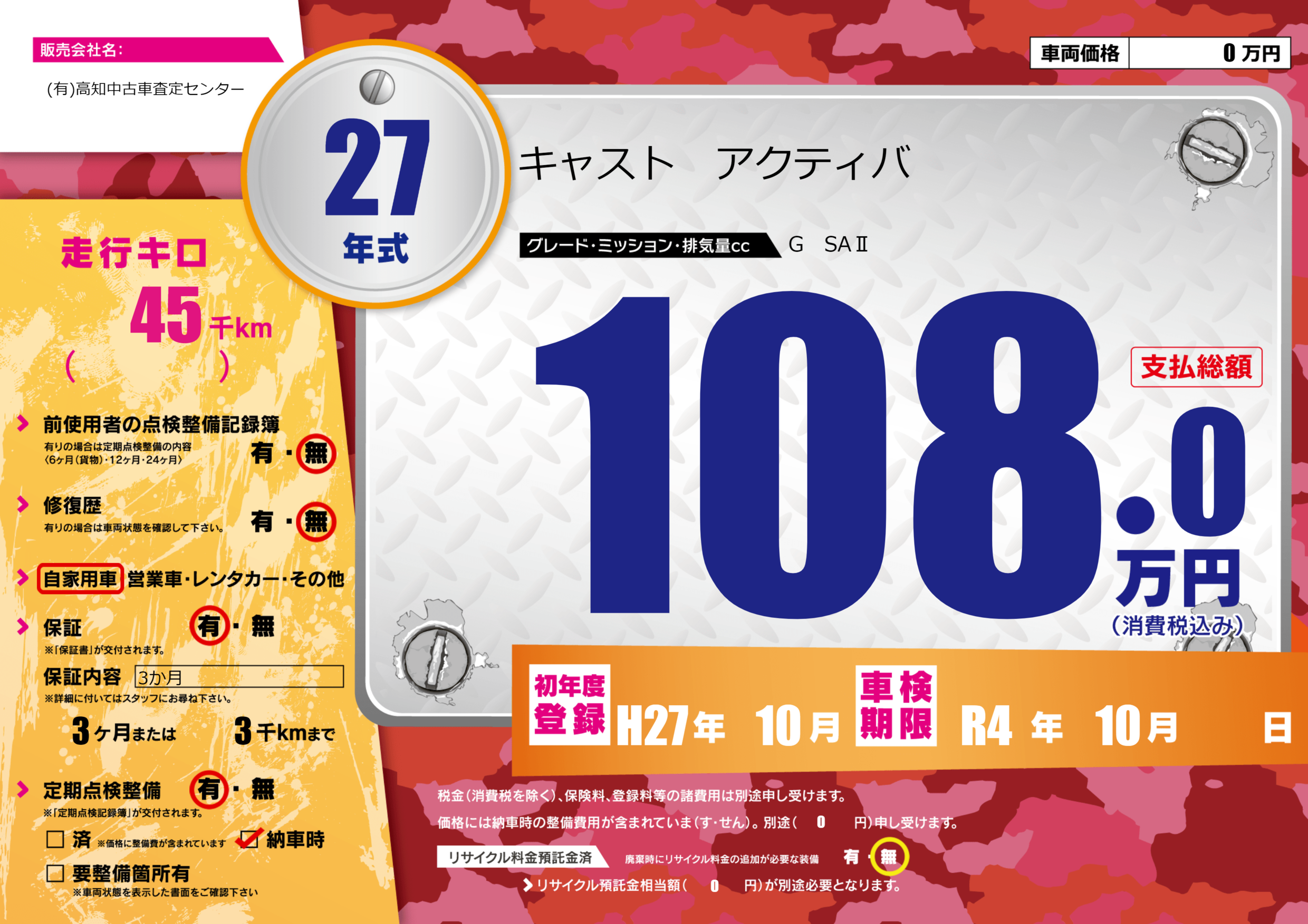 | 走行キロ | 4.5万km | 初年度登録 | H27年10月 |