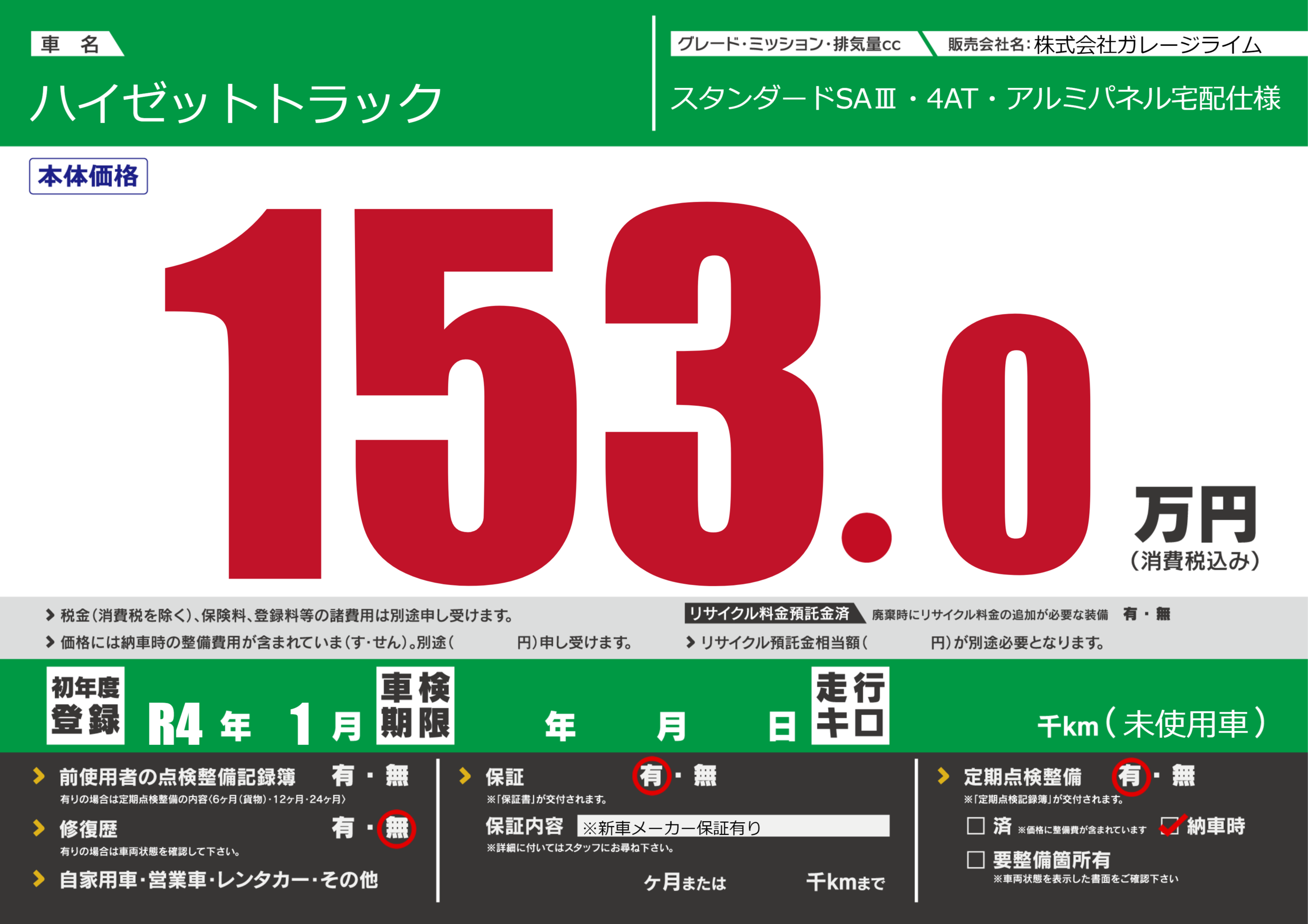 保証付き 保証内容(※新車メーカー保証有り) ---ヶ月または()千kmまで |