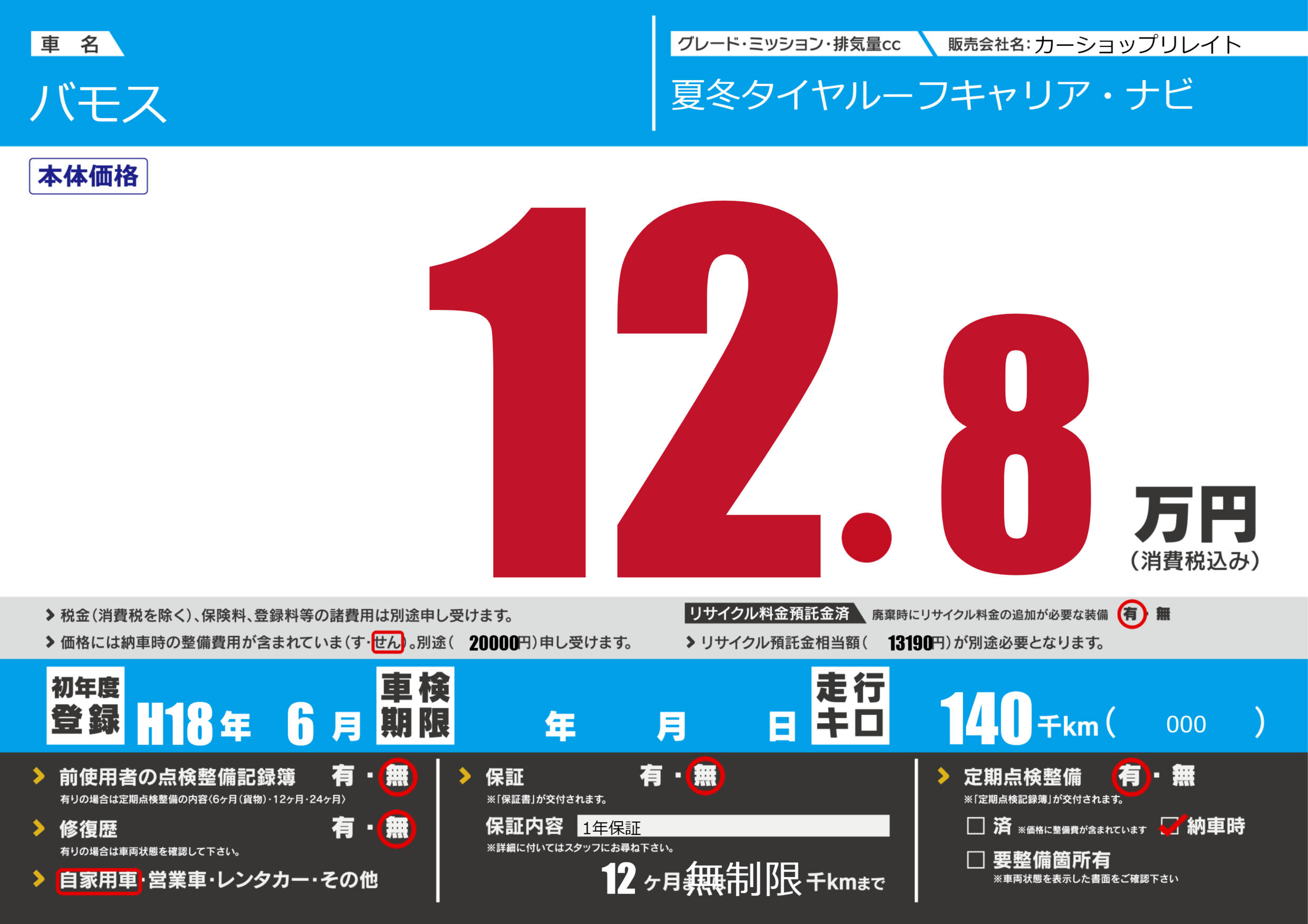 | 走行キロ | 14万km | 初年度登録 | H18年6月 |