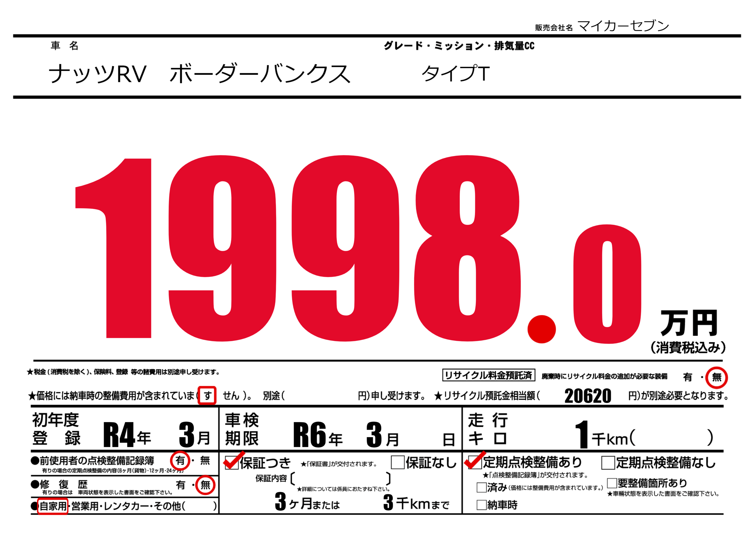 | 車名 | ナッツRV ボーダーバンクス | グレード ミッション 排気量 |