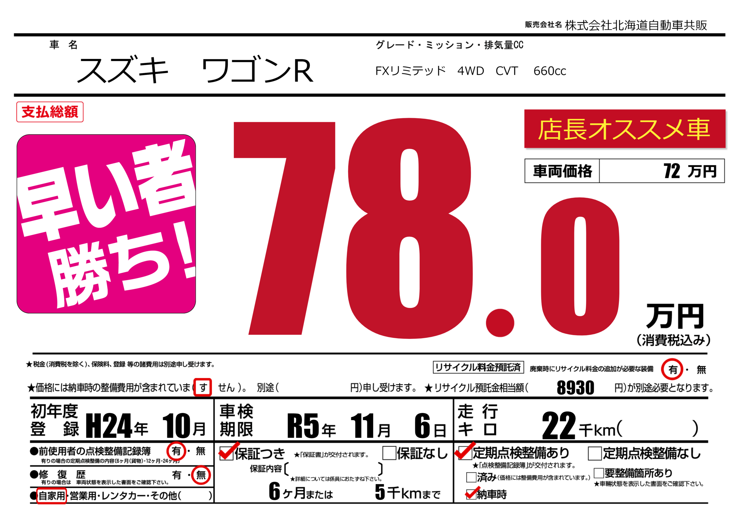 保証付き 保証内容(---) 6ヶ月または(5)千kmまで |