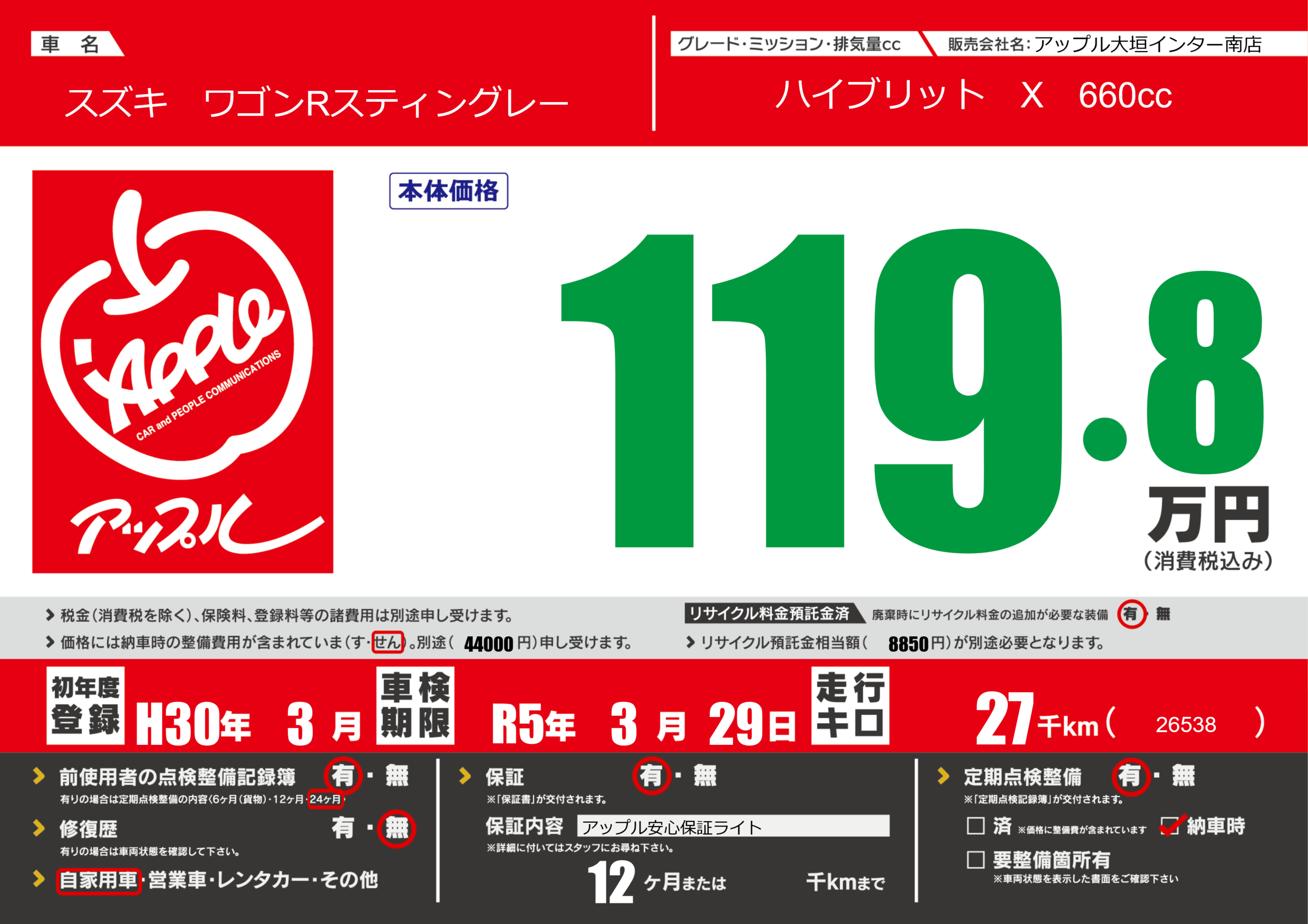 保証付き 保証内容(アップル安心保証ライト) 12ヶ月または()千kmまで |