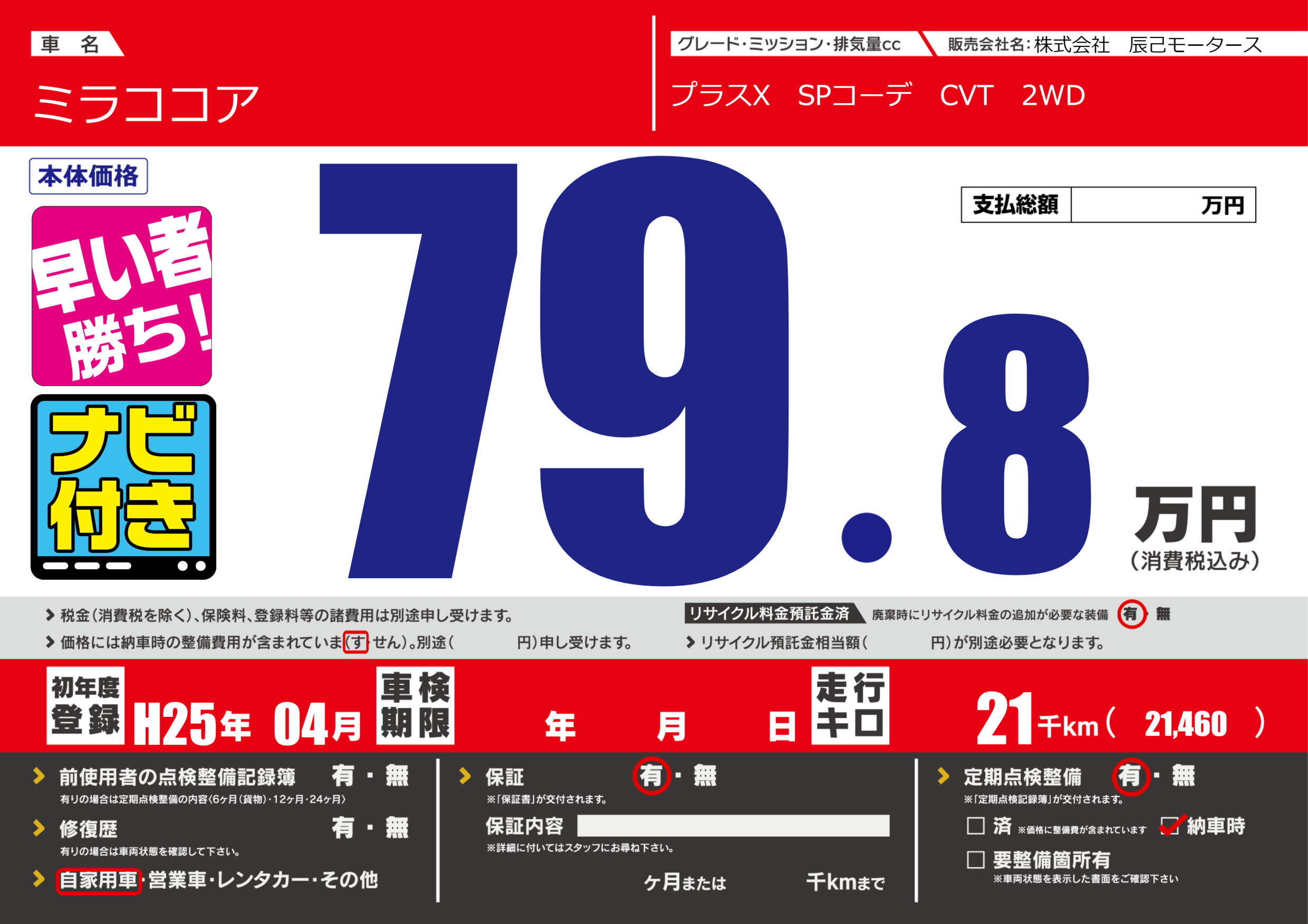 | 定期点検整備 | 定期点検整備あり 納車時あり | ||