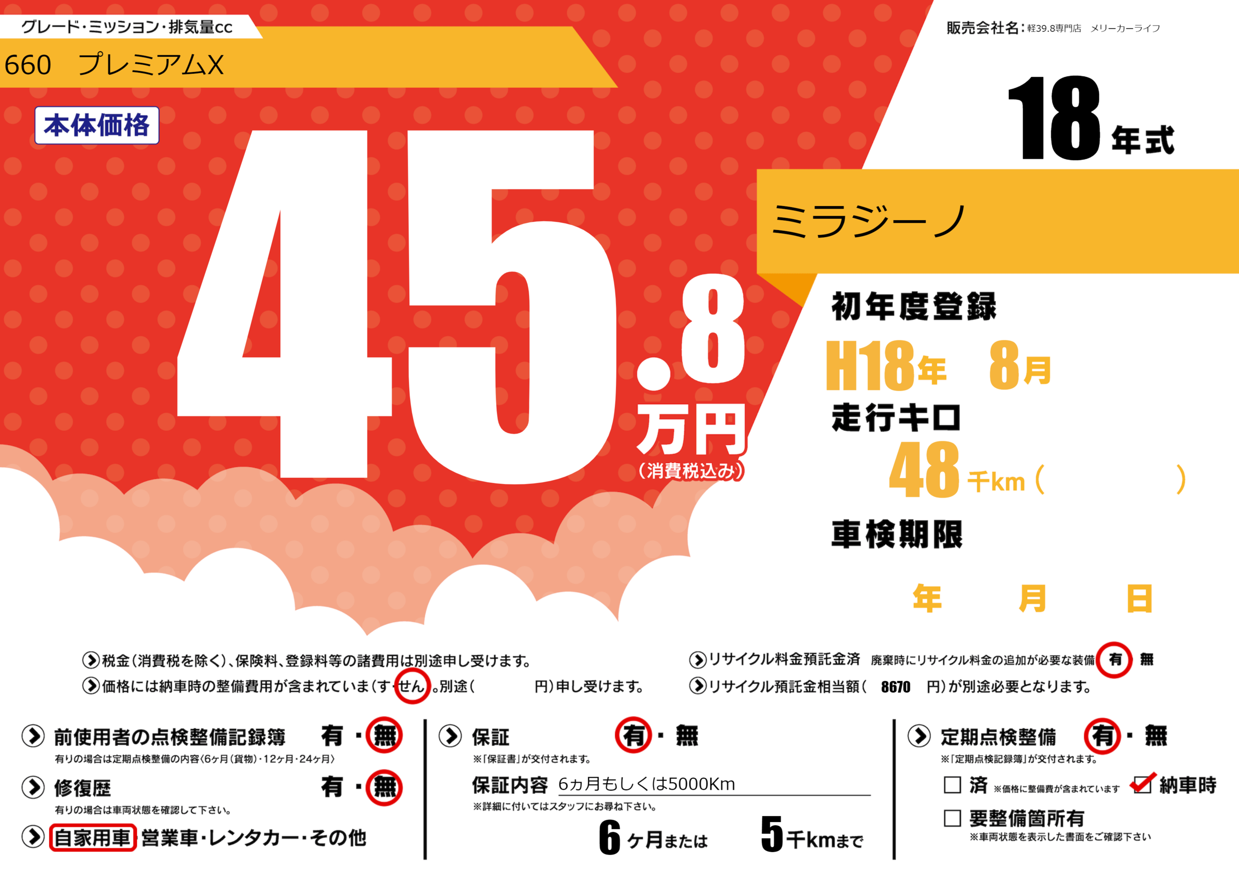 | 車名 | ミラジーノ | グレード ミッション 排気量 |