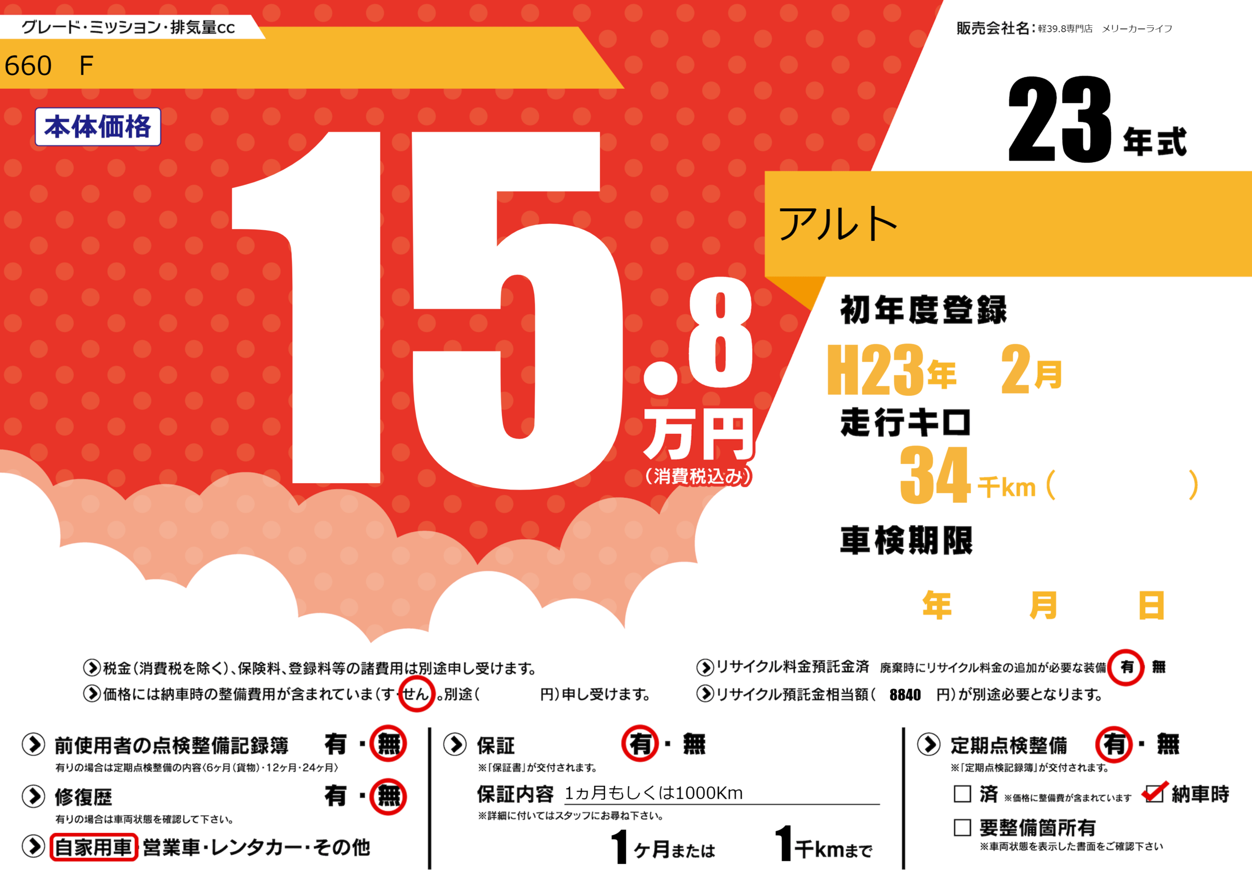 | 定期点検整備 | 定期点検整備あり 納車時あり | ||