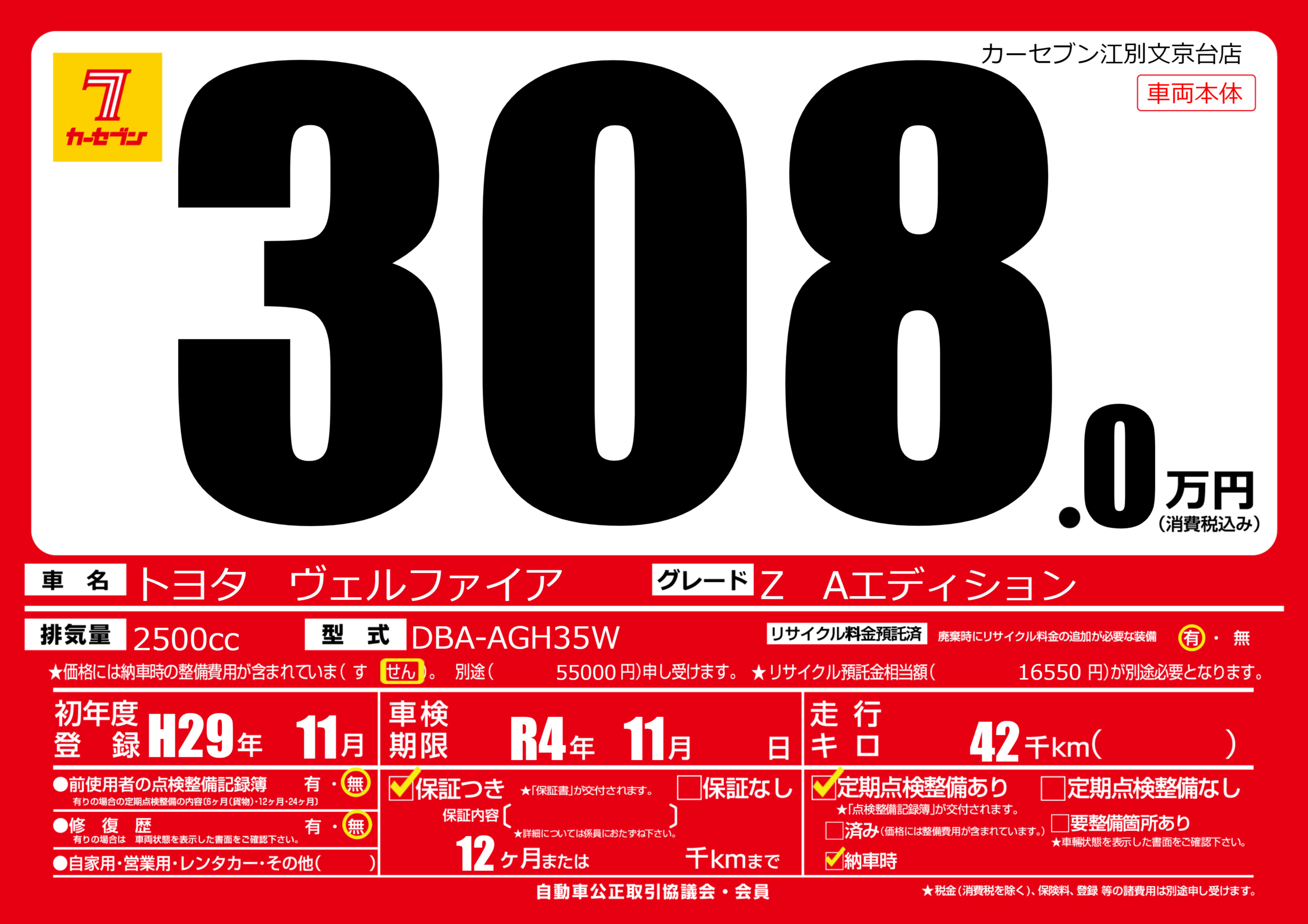 保証付き 保証内容(---) 12ヶ月または()千kmまで |