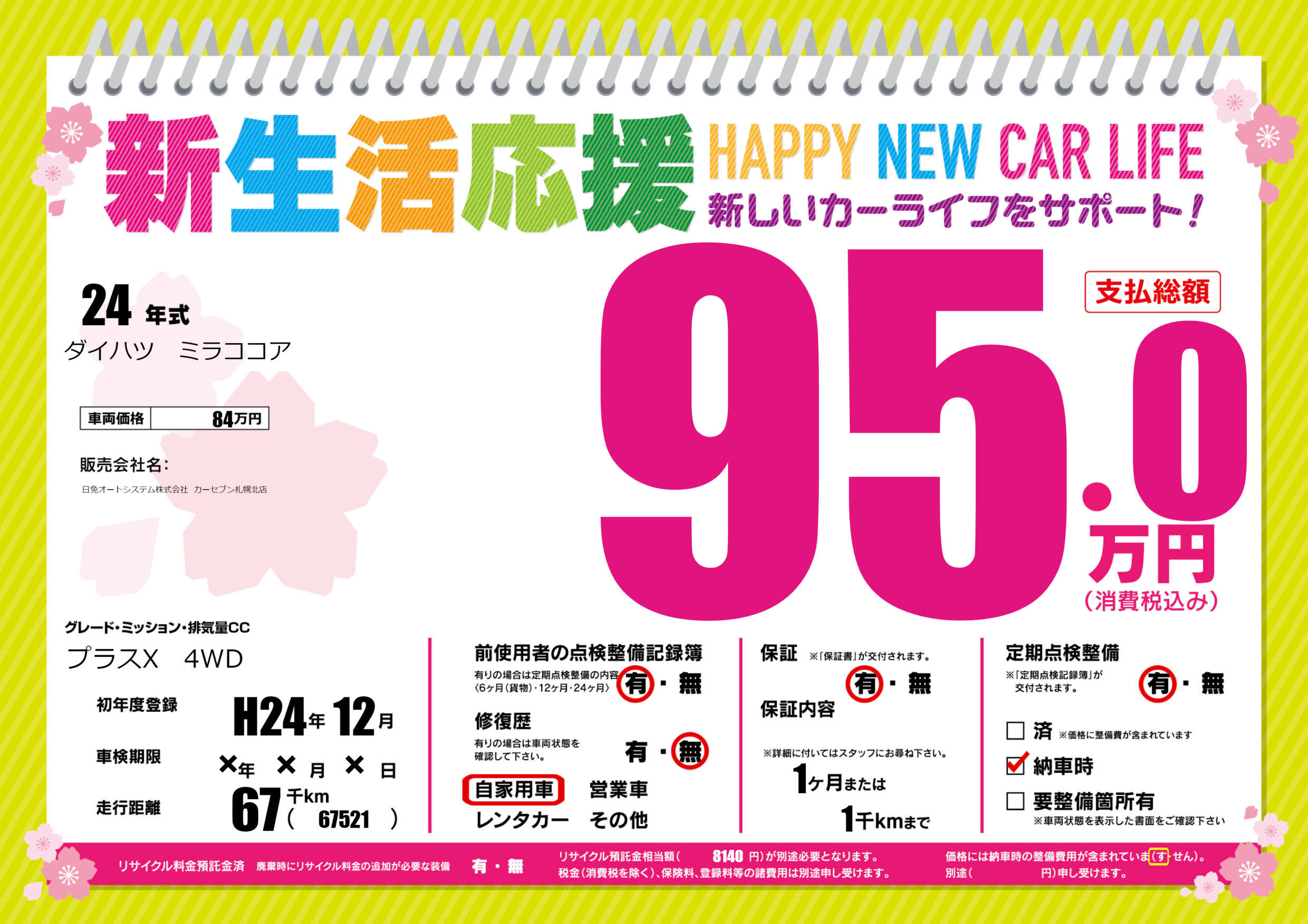 | 車名 | ダイハツ ミラココア | グレード ミッション 排気量 |
