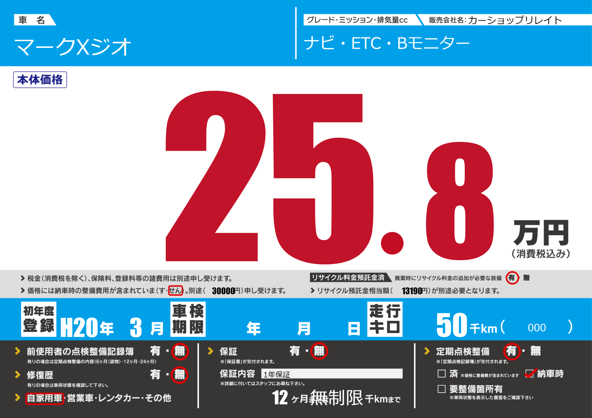 | 走行キロ | 5万km | 初年度登録 | H20年3月 |