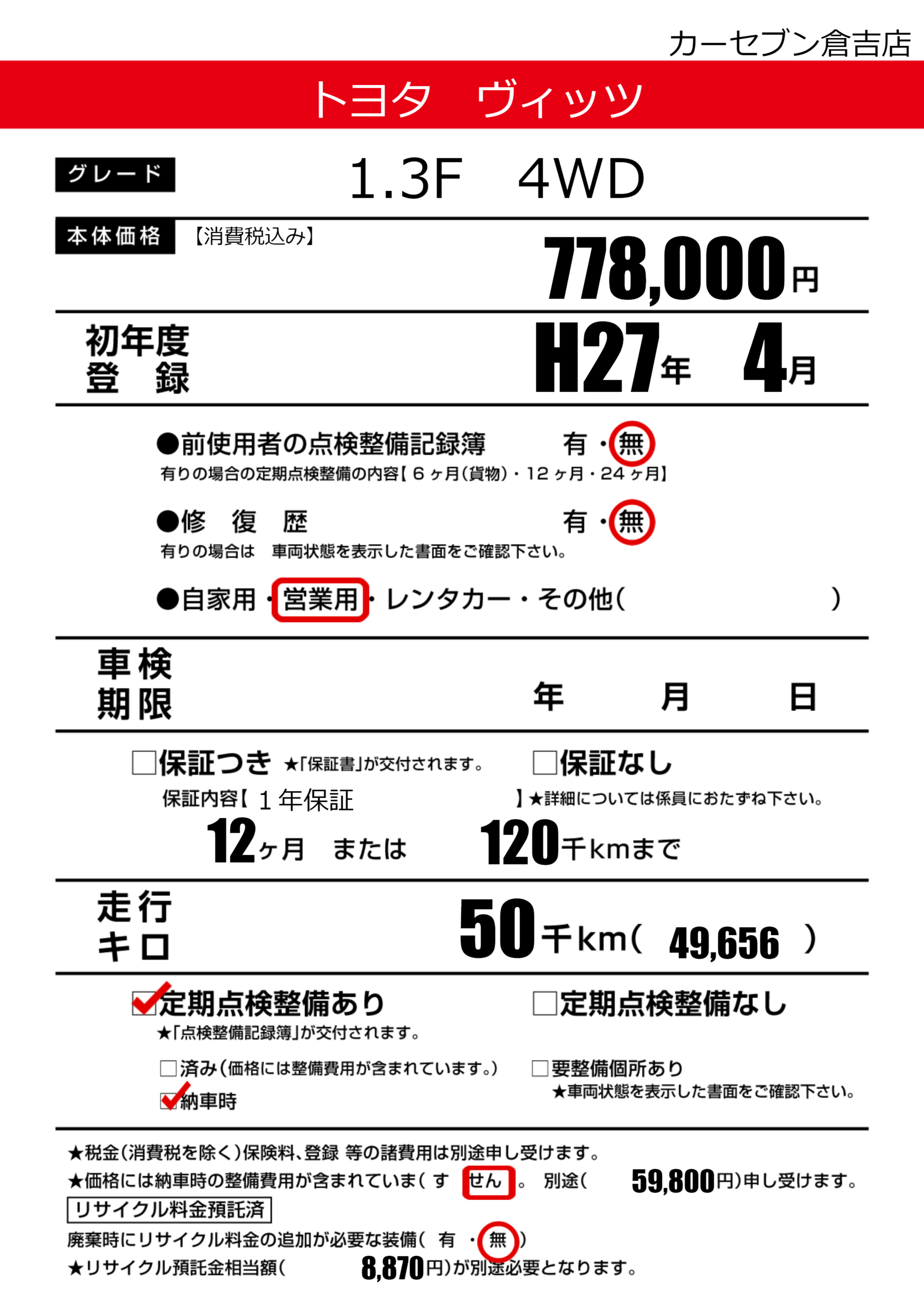 | 車名 | トヨタ ヴィッツ | グレード ミッション 排気量 |