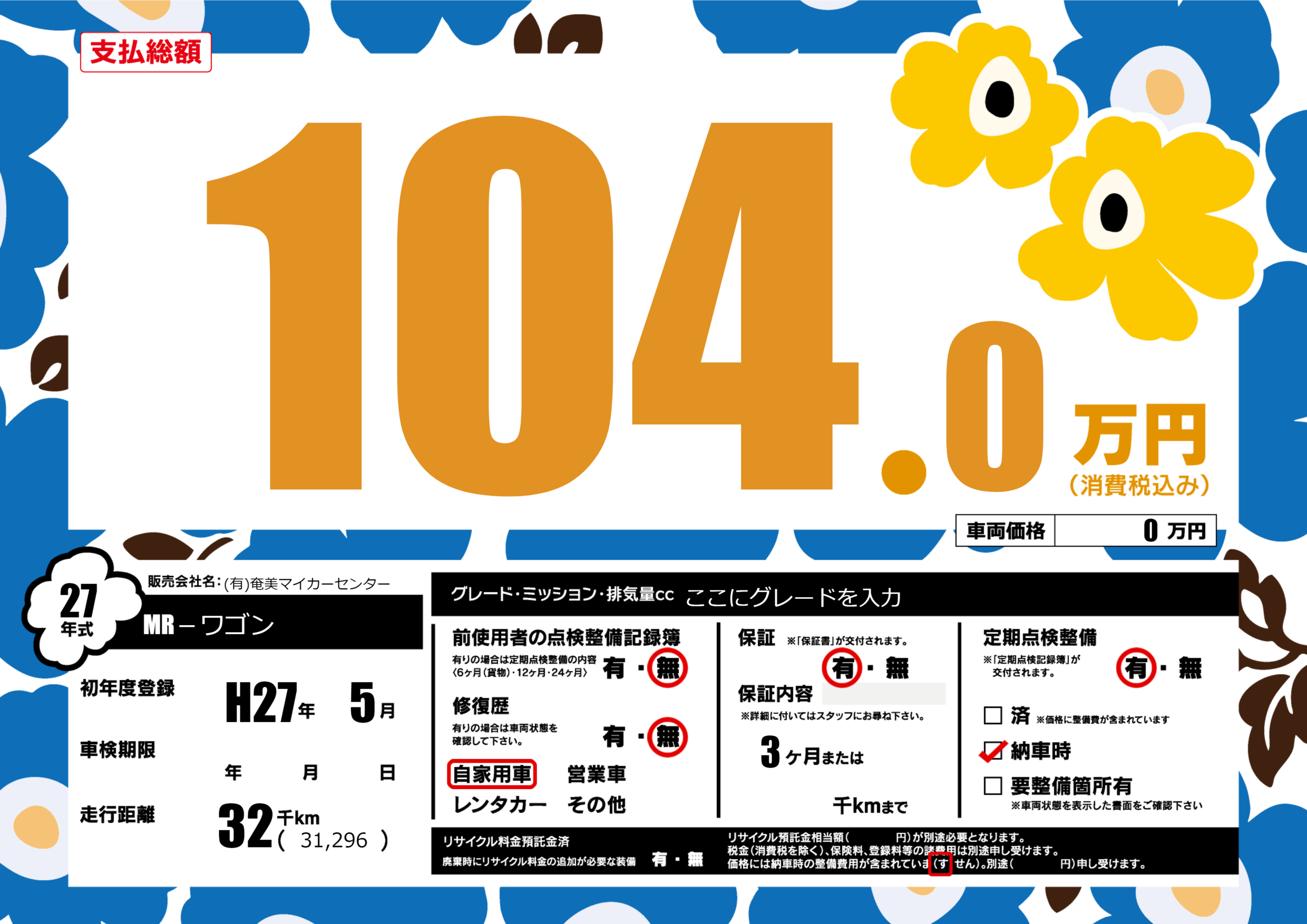 | 車名 | MR-ワゴン | グレード ミッション 排気量 |