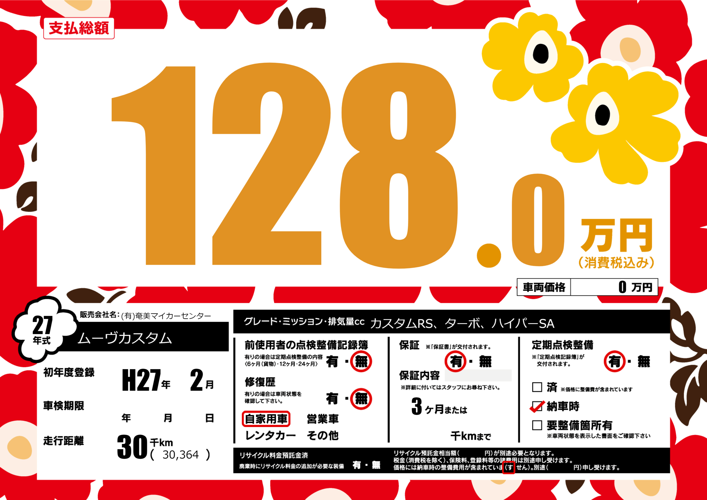 | 走行キロ | 3万km | 初年度登録 | H27年2月 |