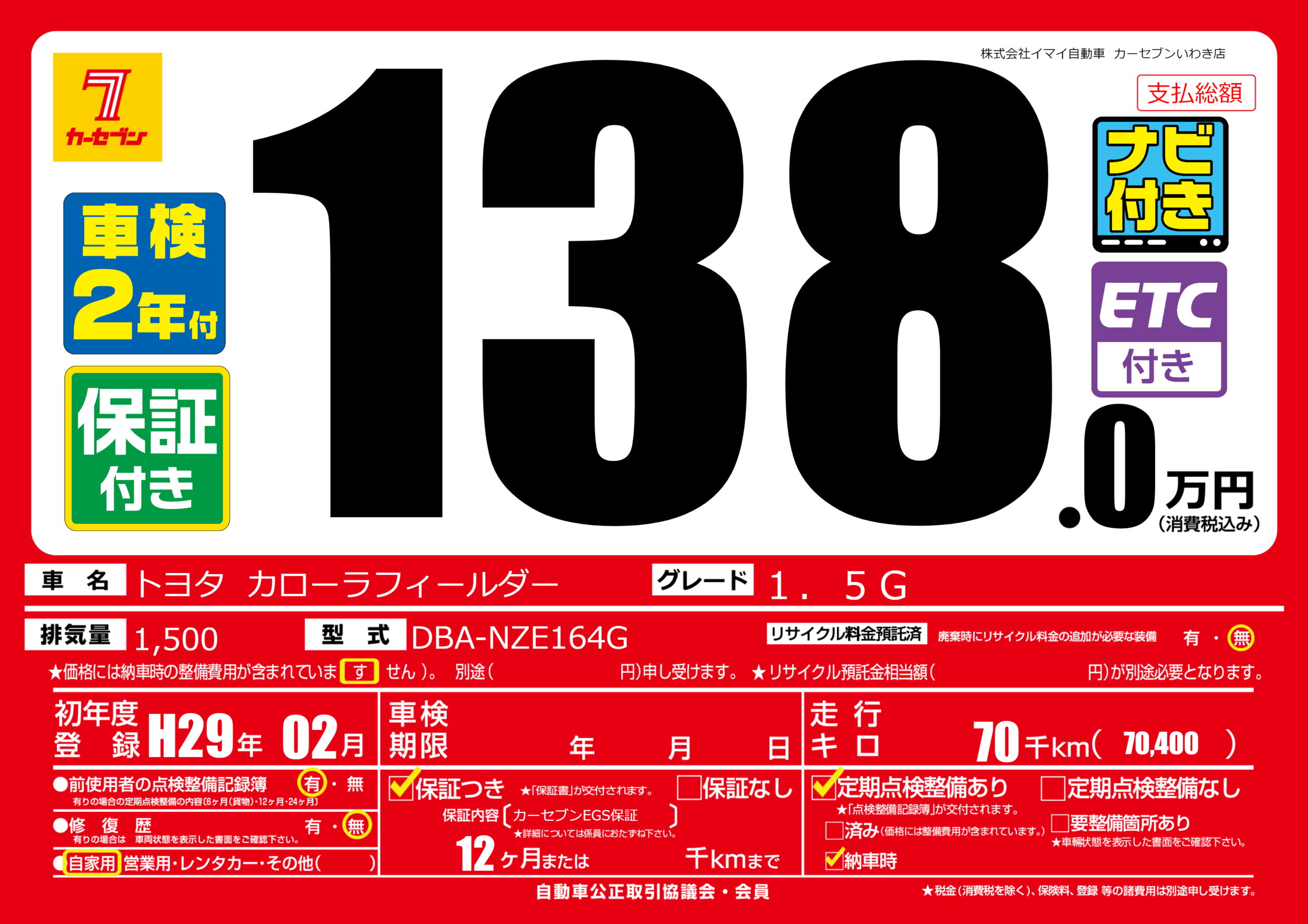 | 車名 | トヨタ カローラフィールダー | グレード ミッション 排気量 |