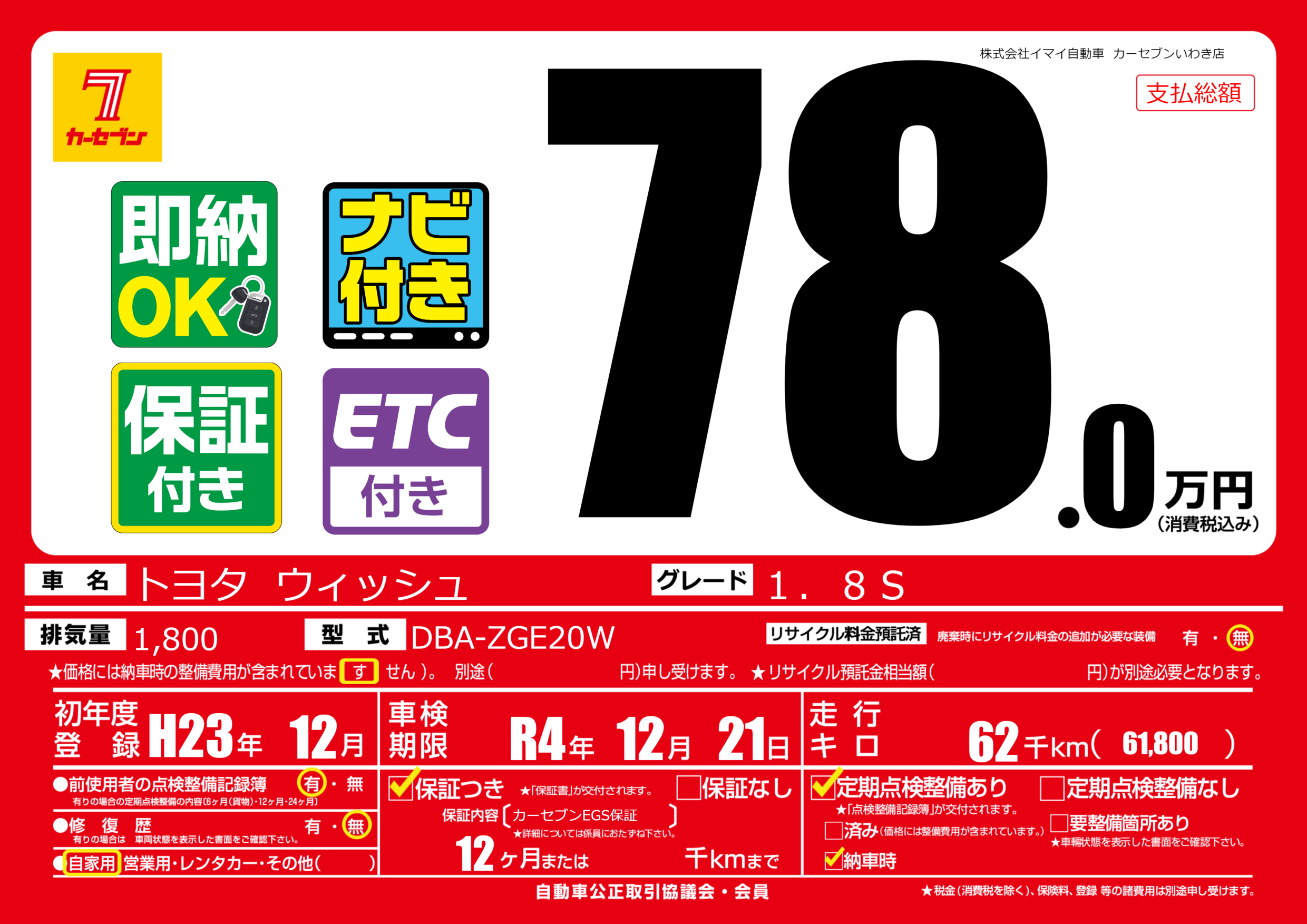 | 車名 | トヨタ ウィッシュ | グレード ミッション 排気量 |
