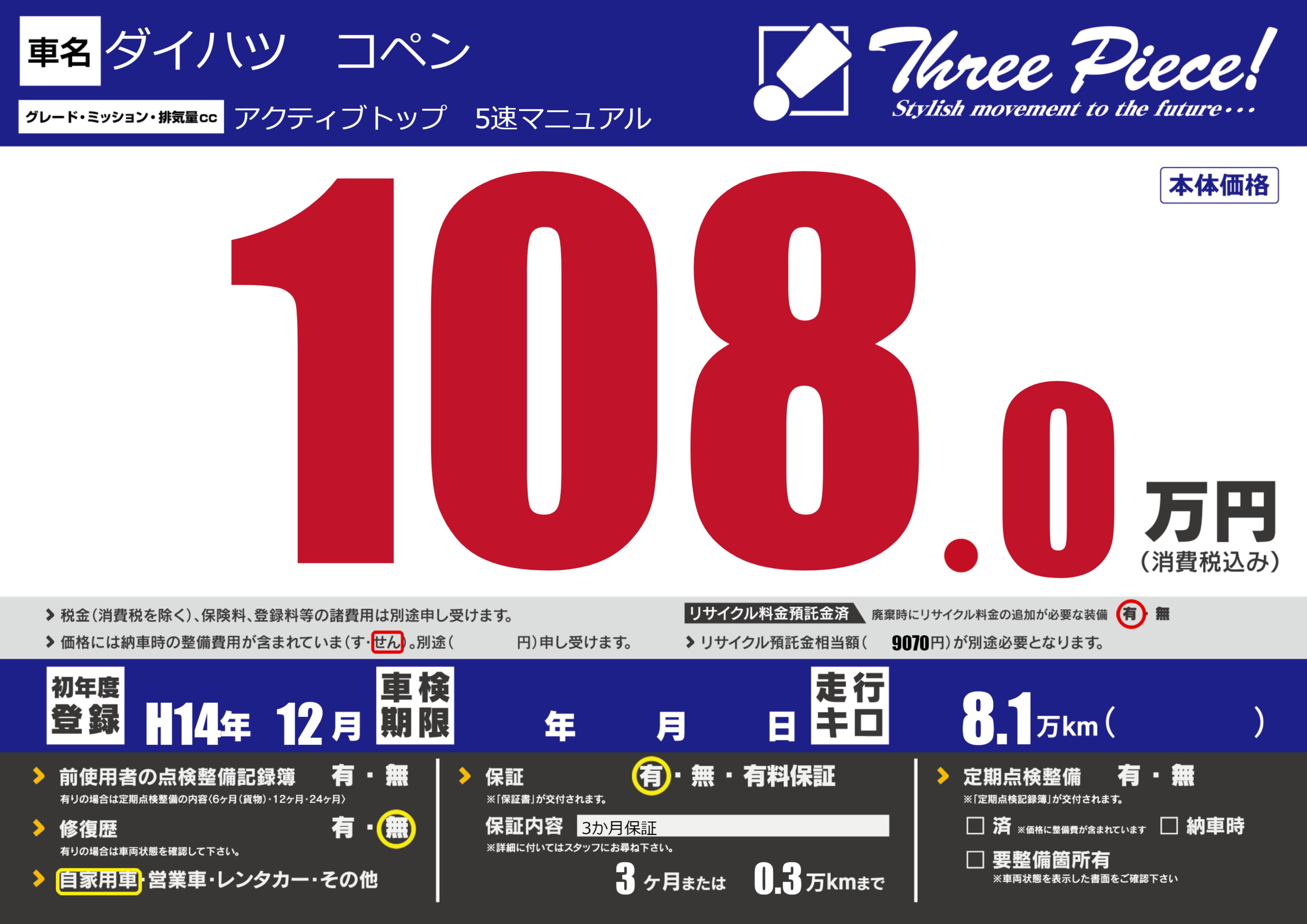 保証付き 保証内容(3か月保証) 3ヶ月または(0.3)千kmまで |
