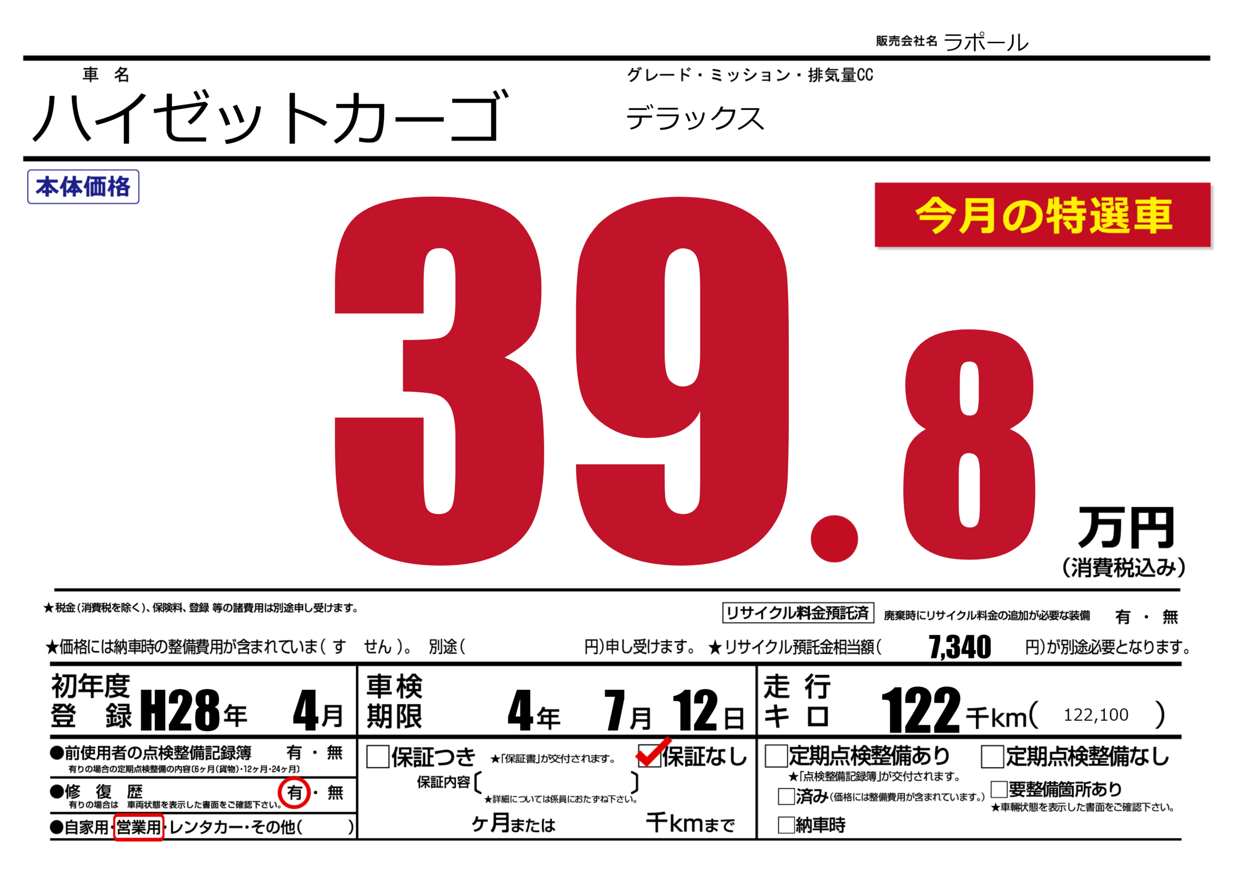 保証なし 保証内容(---) ヶ月または()千kmまで |