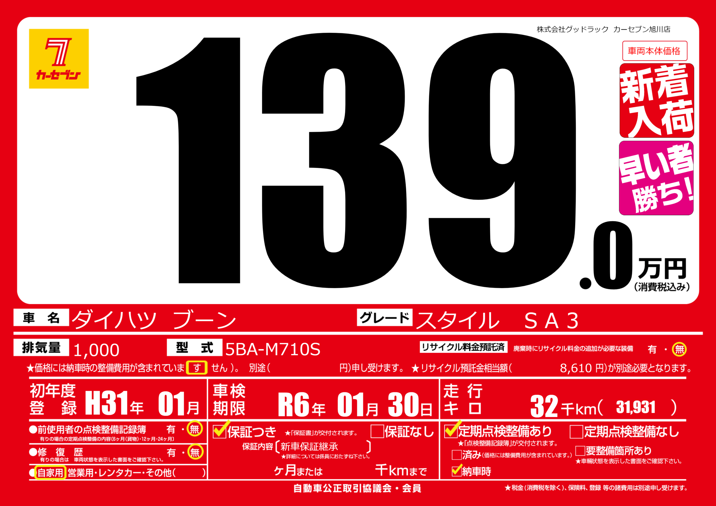 | 車名 | ダイハツ ブーン | グレード ミッション 排気量 |