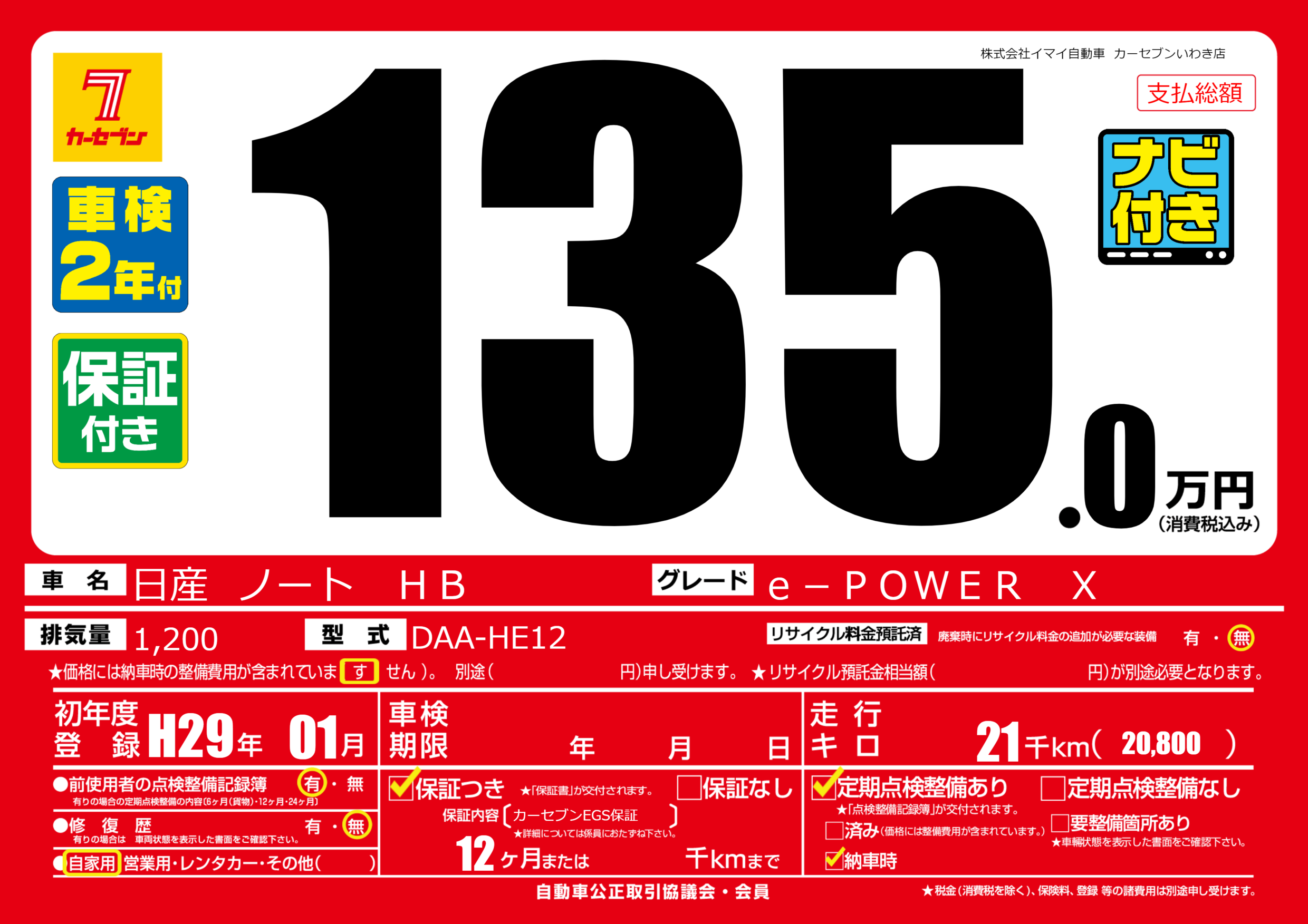 | 車名 | 日産 ノート HB | グレード ミッション 排気量 |