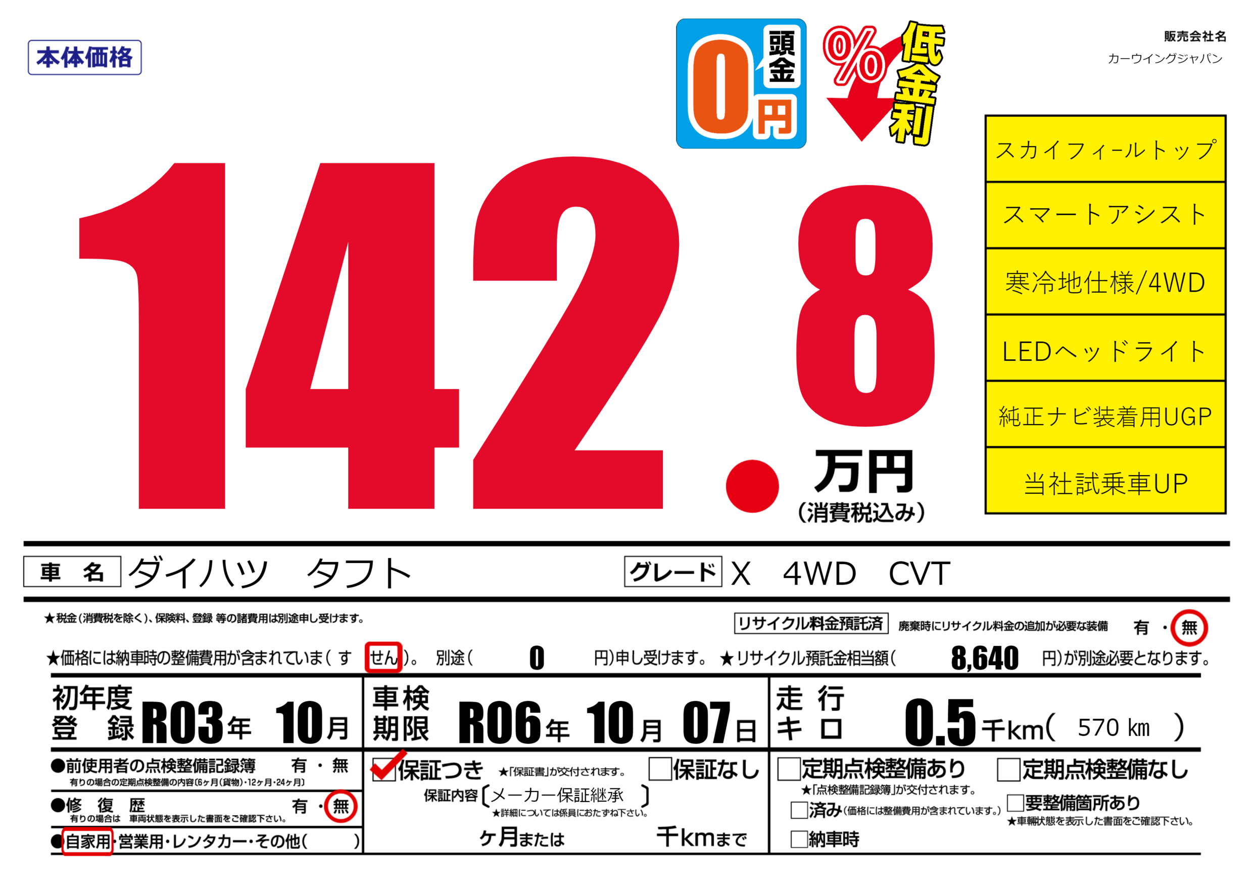 保証付き 保証内容(メーカー保証継承) ---ヶ月または()千kmまで |