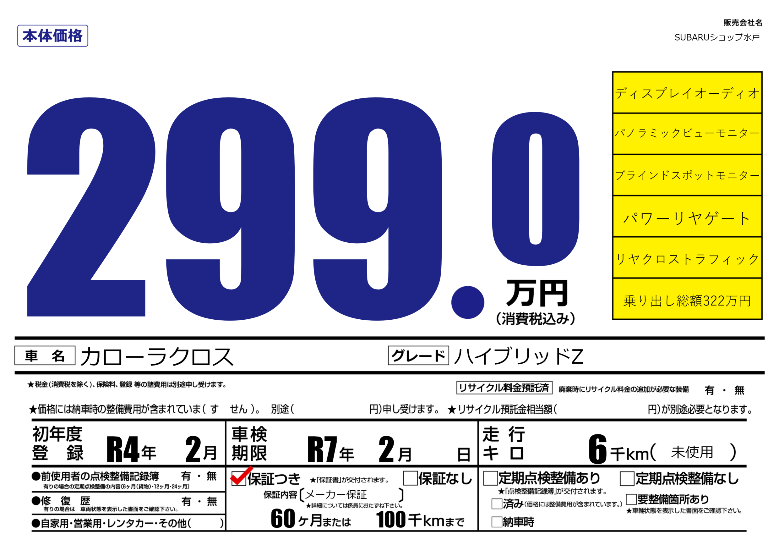 | 車名 | カローラクロス | グレード ミッション 排気量 |