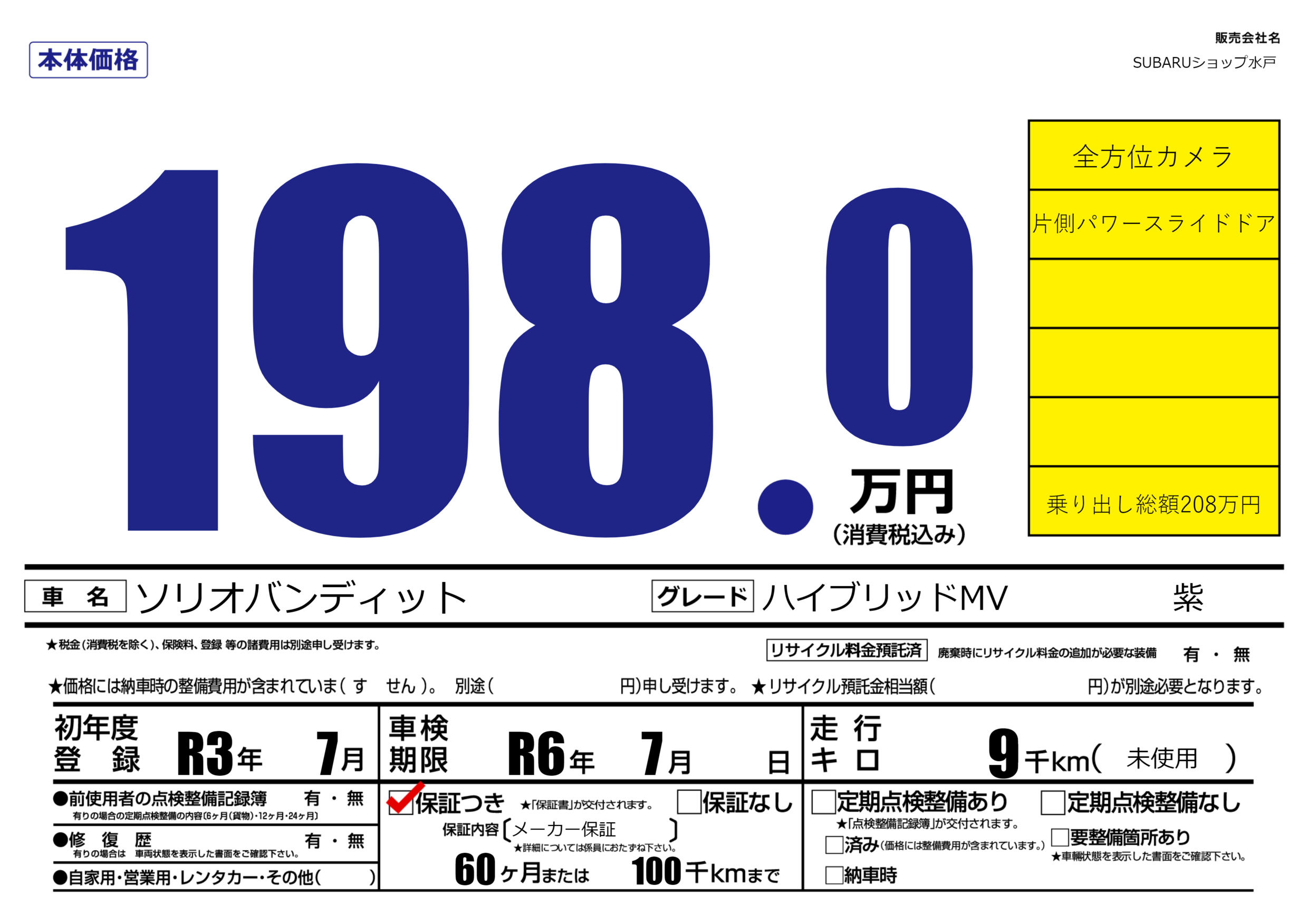 | 走行キロ | 0.9万km | 初年度登録 | R3年7月 |