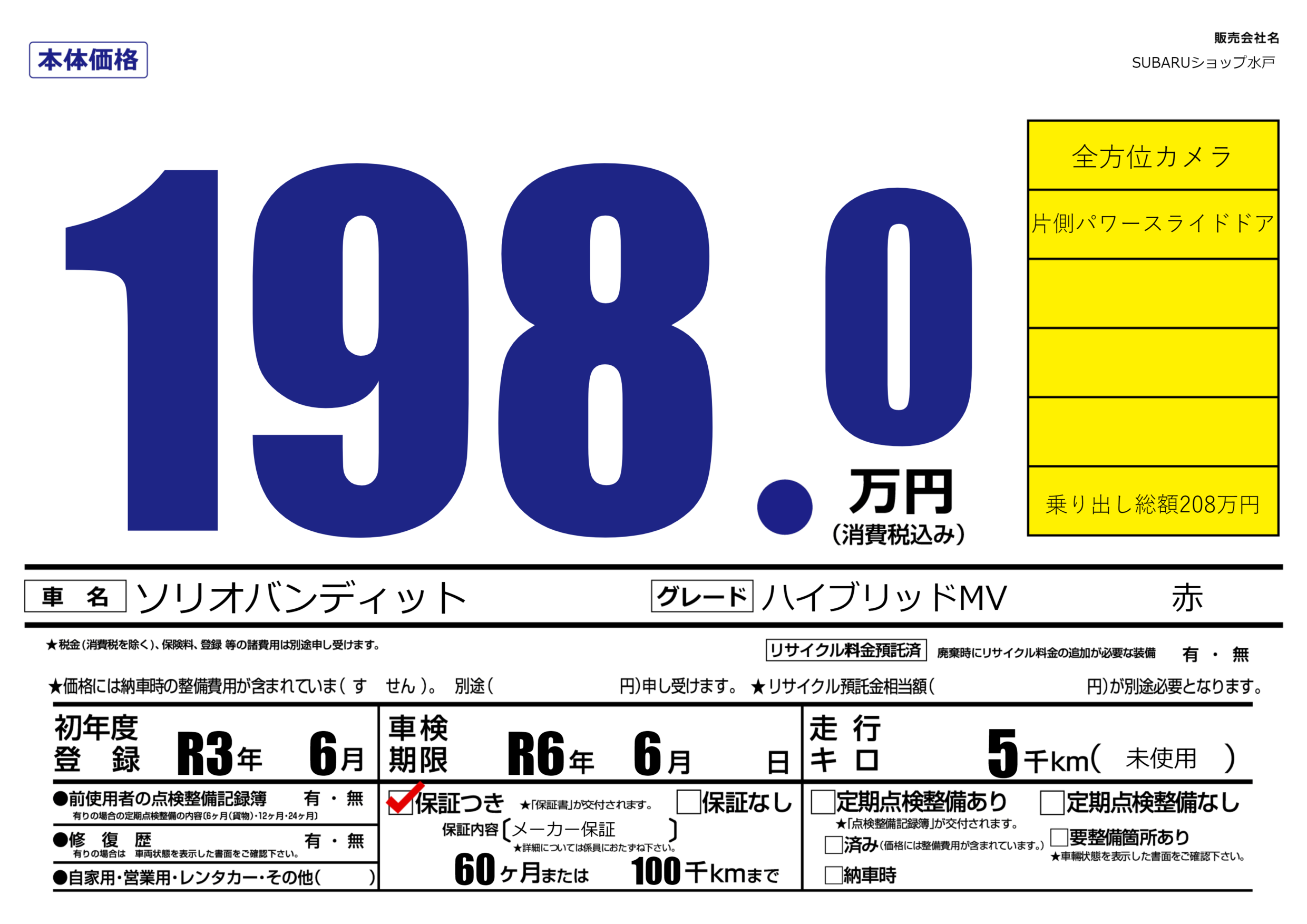 | 走行キロ | 0.5万km | 初年度登録 | R3年6月 |
