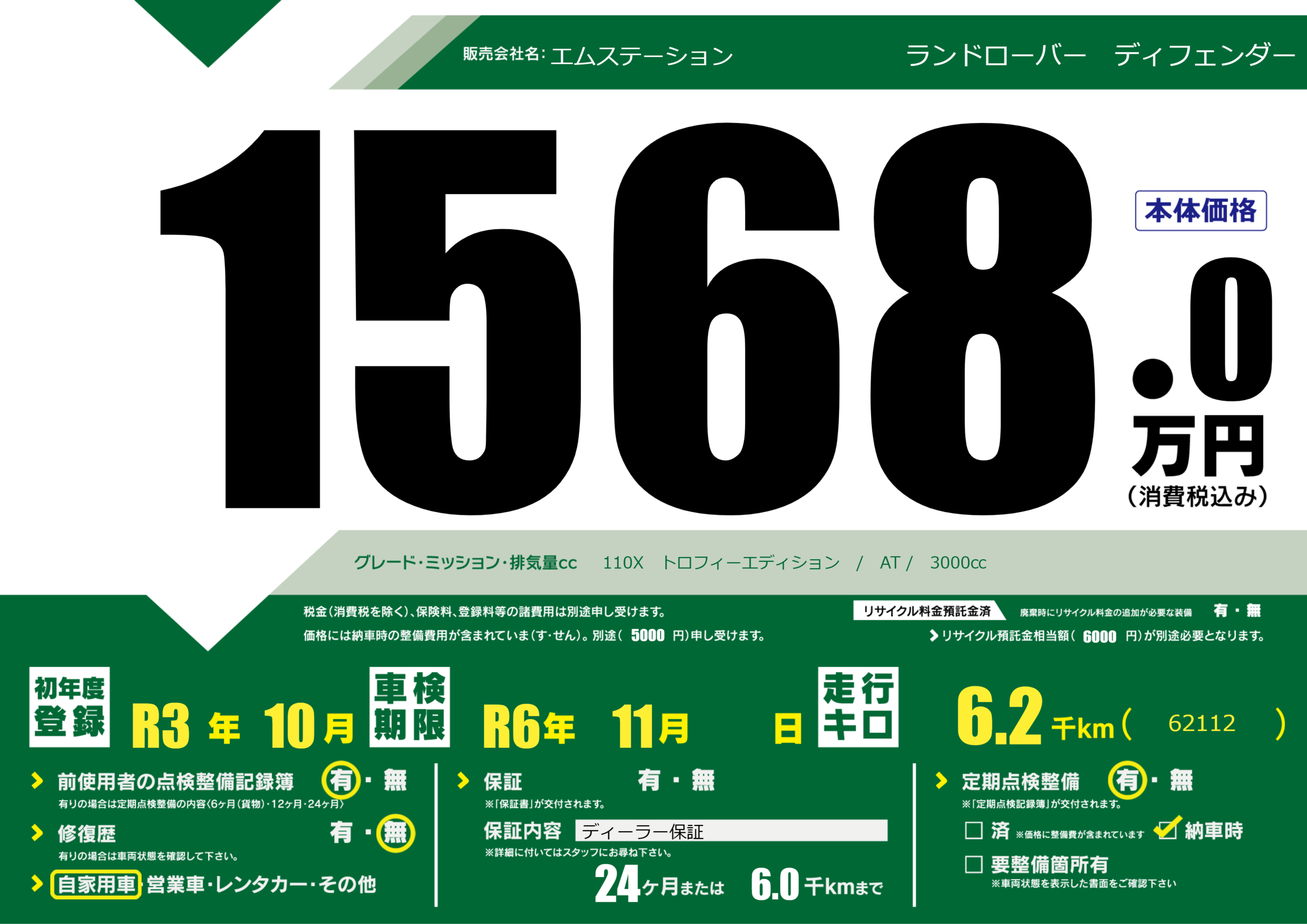 保証なし 保証内容(ディーラー保証) 24ヶ月または(6.0)千kmまで |