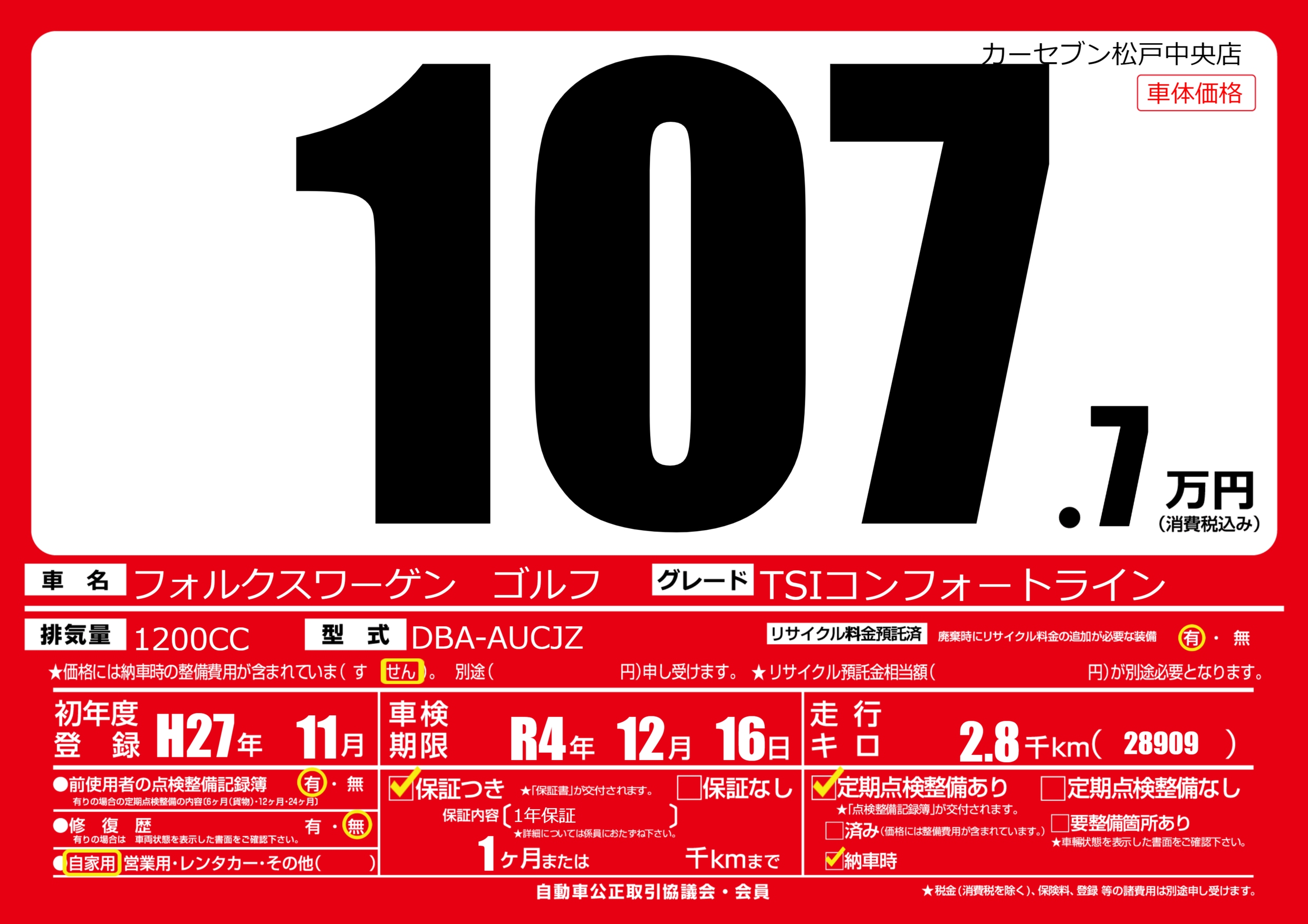 | 車名 | フォルクスワーゲン ゴルフ | グレード ミッション 排気量 |