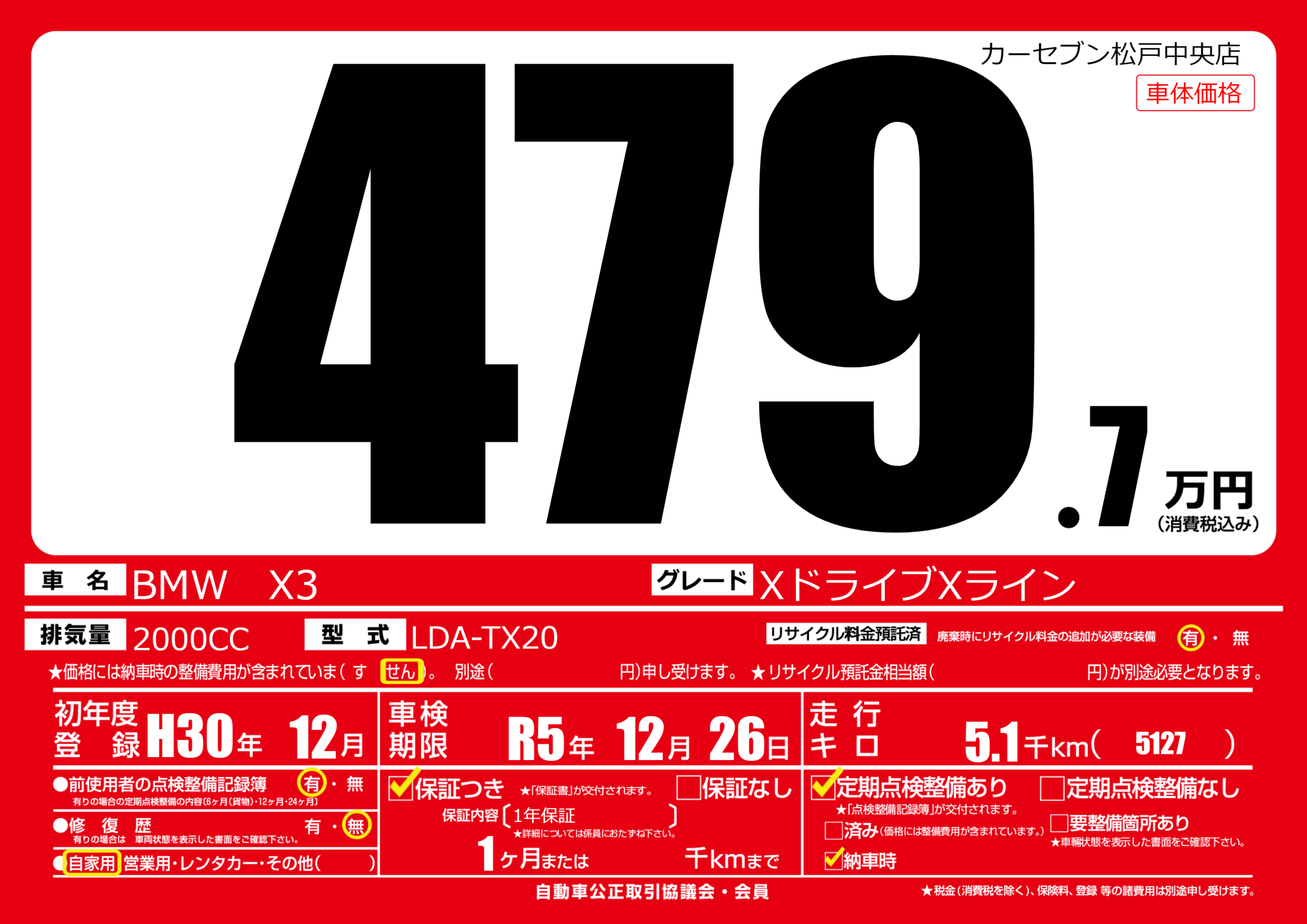| 走行キロ | 0.5万km | 初年度登録 | H30年12月 |