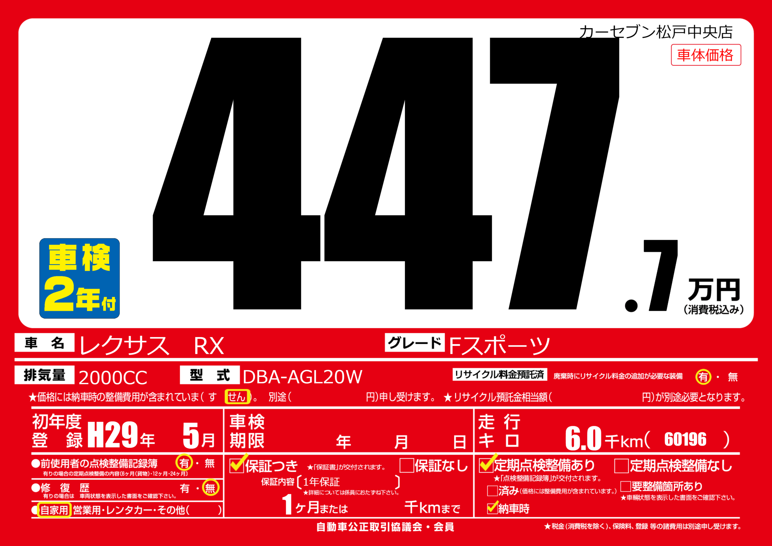 | 車名 | レクサス RX | グレード ミッション 排気量 |