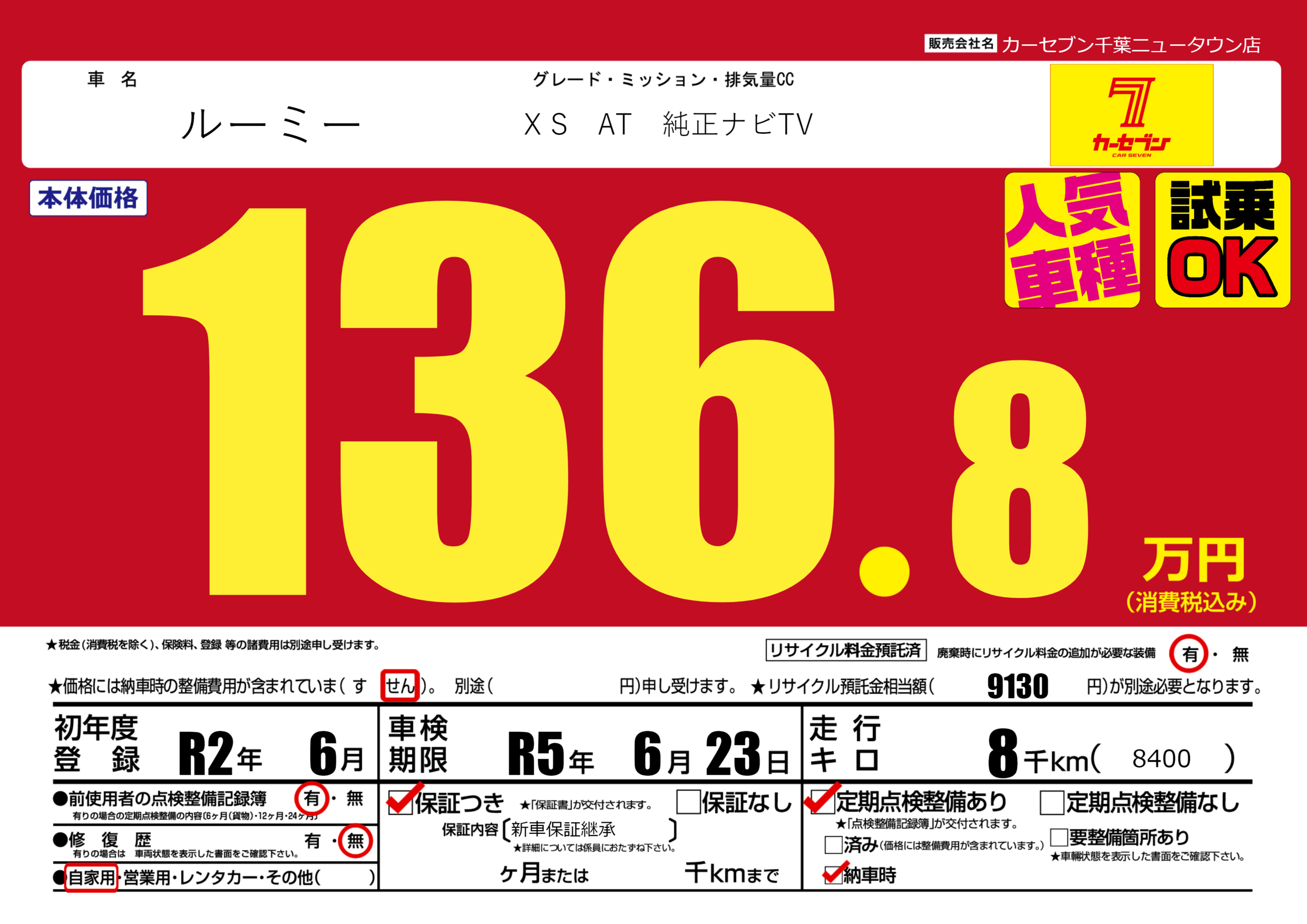 | 走行キロ | 0.8万km | 初年度登録 | R2年6月 |