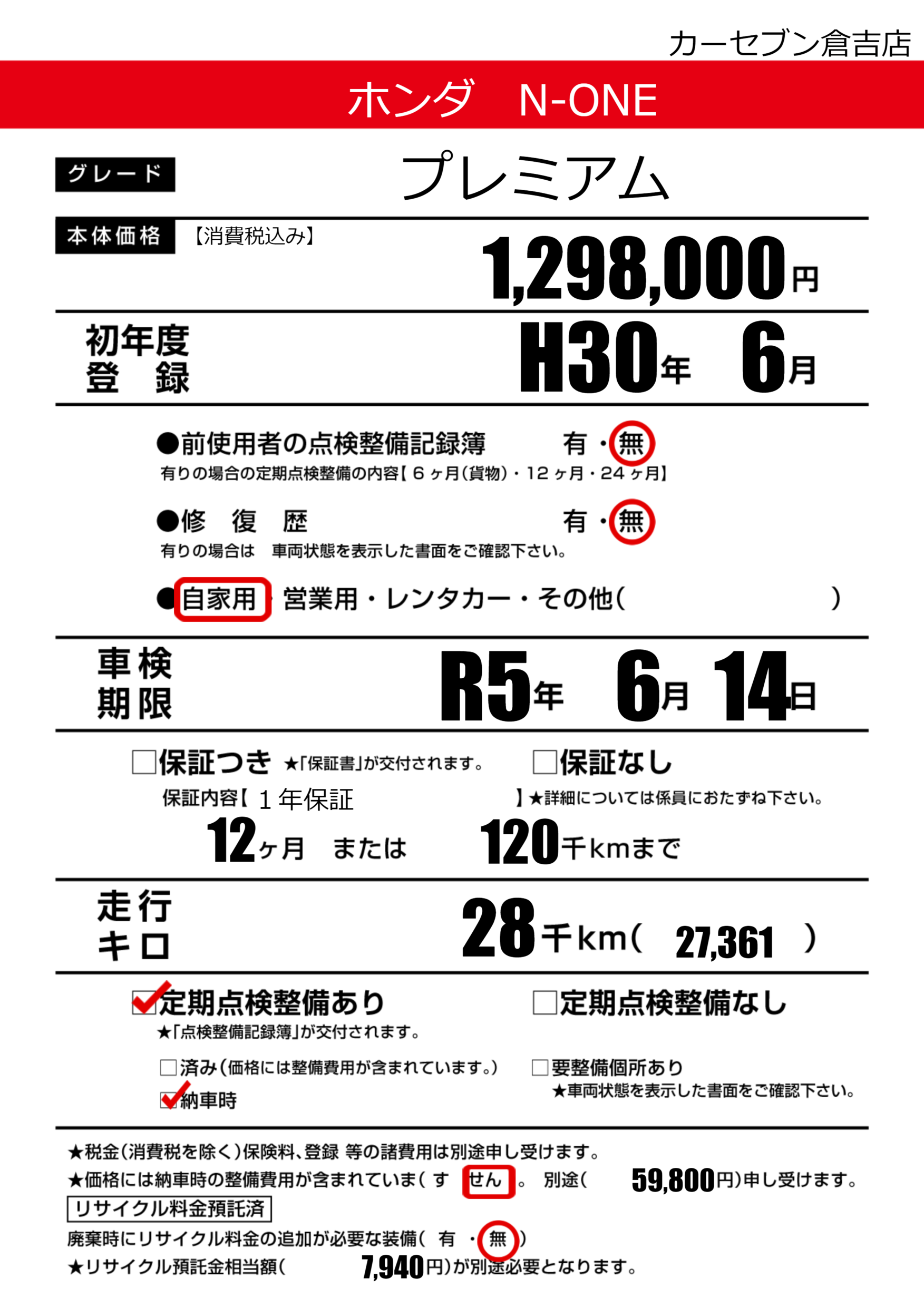 | 車名 | ホンダ N-ONE | グレード ミッション 排気量 |