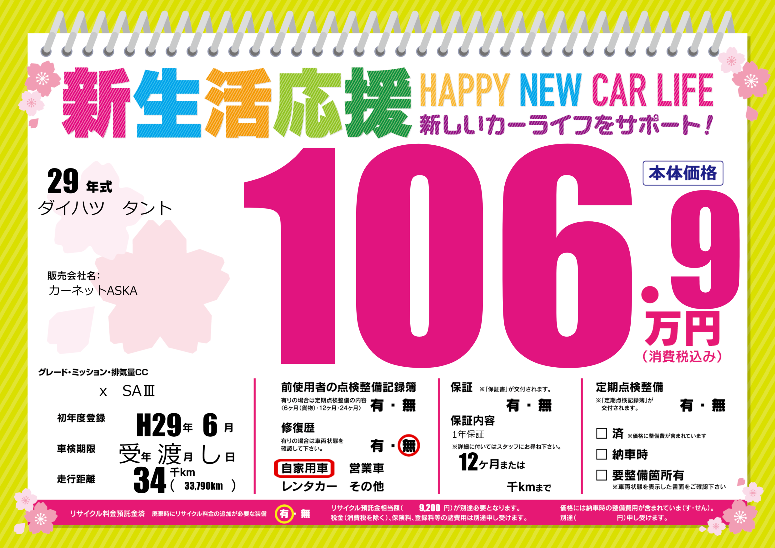 | 車名 | ダイハツ タント | グレード ミッション 排気量 |