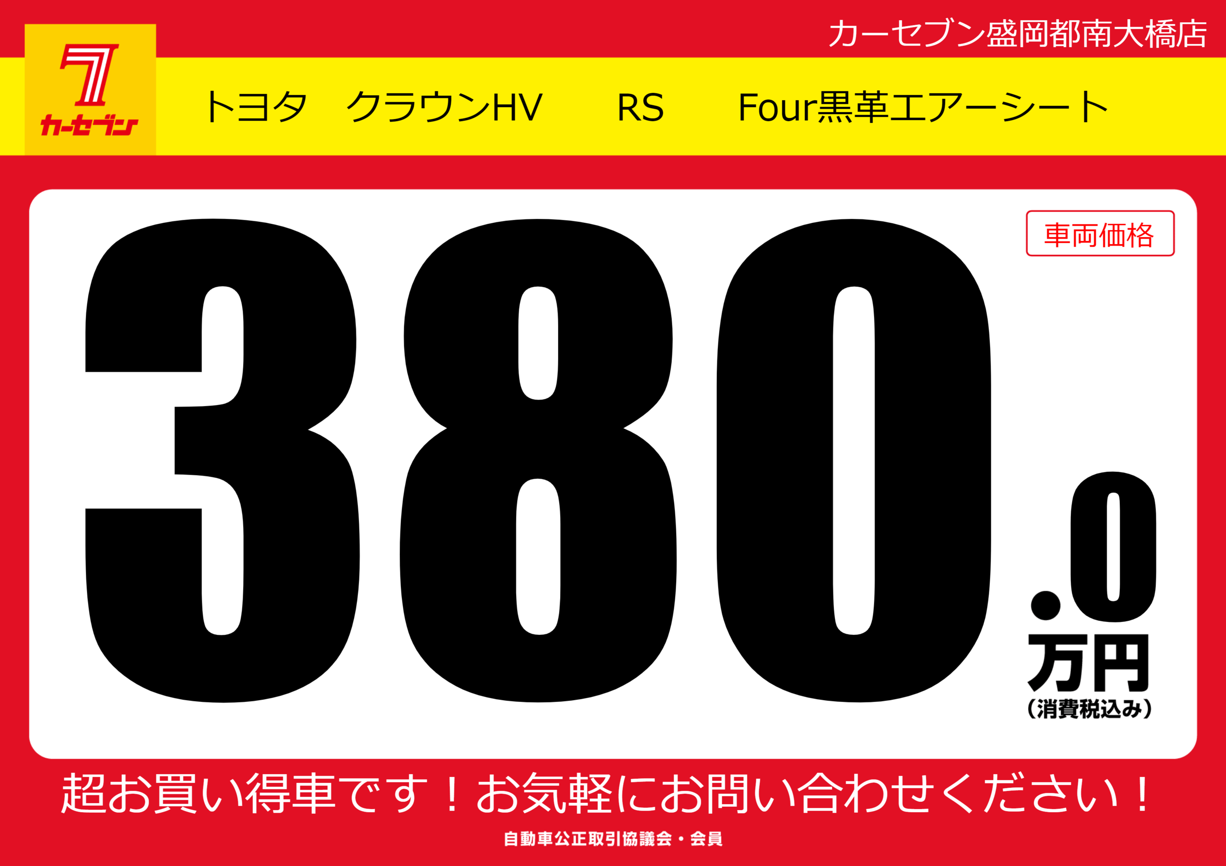 | 車名 | トヨタ クラウンHV RS Four黒革エアーシート | グレード ミッション 排気量 |