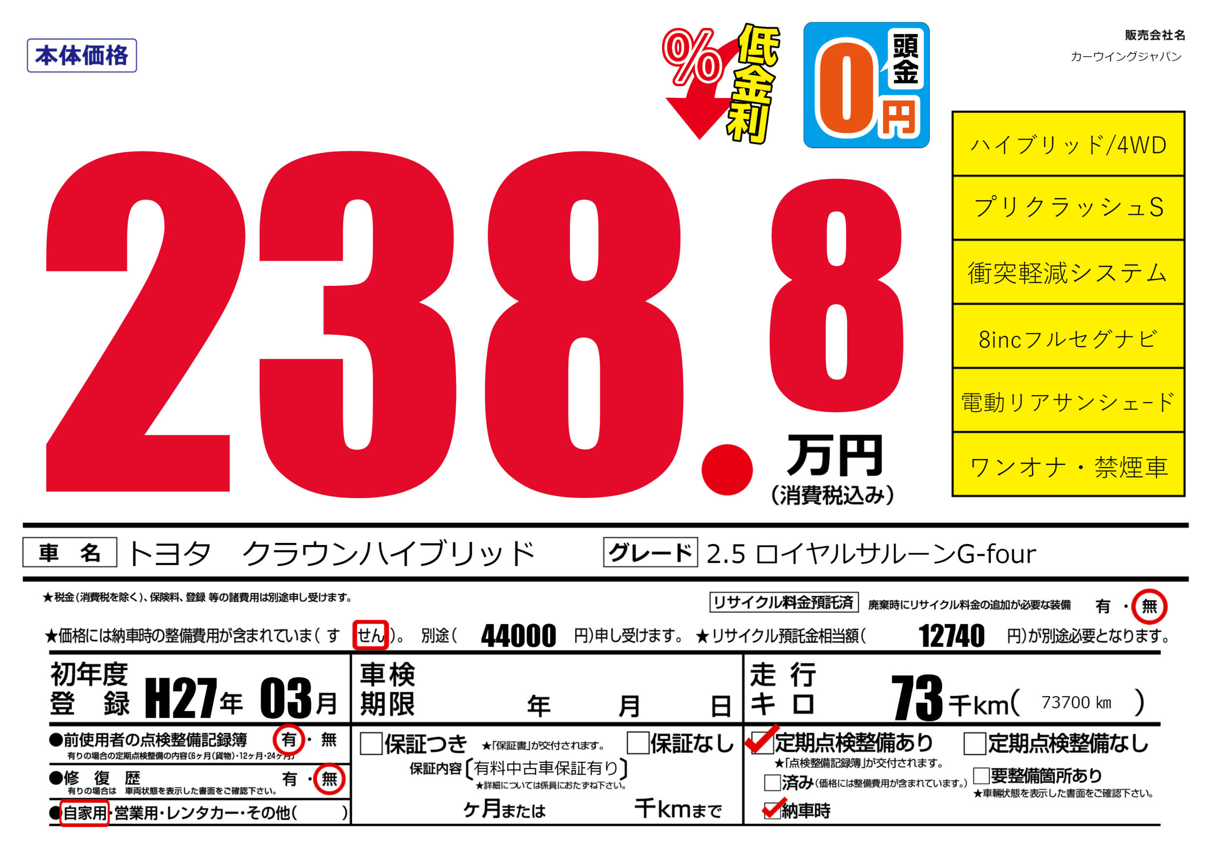 | 車名 | トヨタ クラウンハイブリッド | グレード ミッション 排気量 |