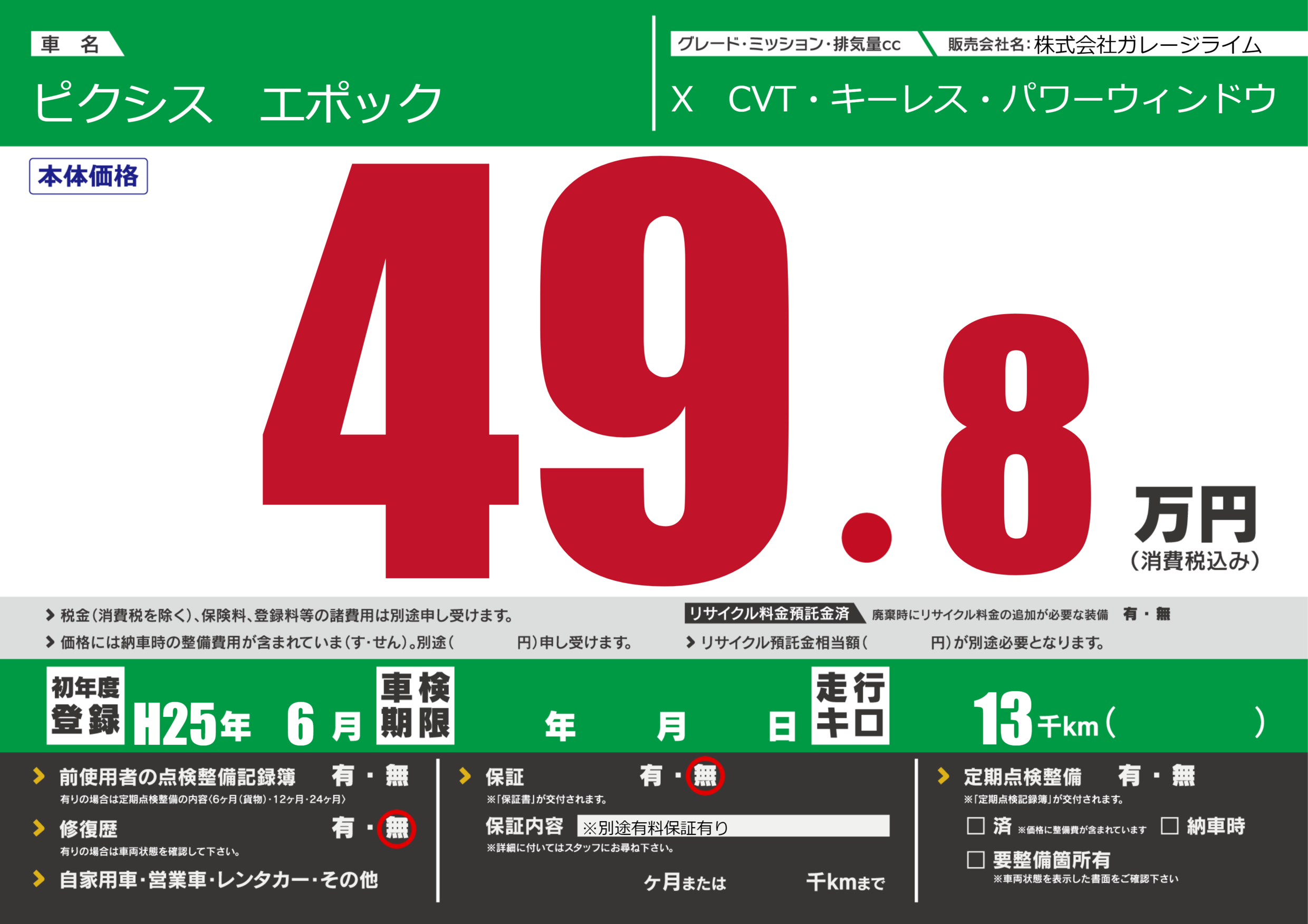 | 車名 | ピクシス エポック | グレード ミッション 排気量 |