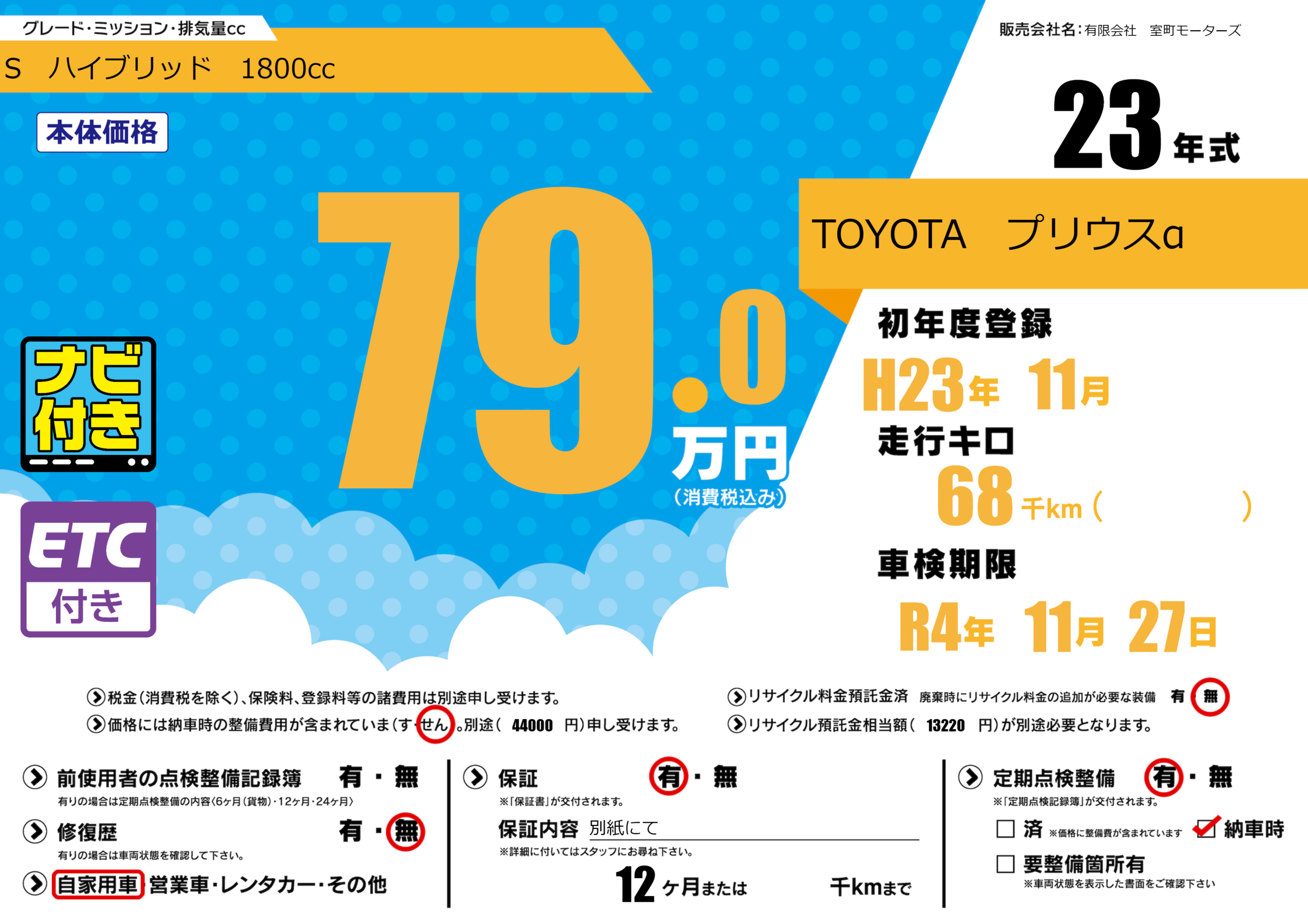 | 車名 | TOYOTA プリウスα | グレード ミッション 排気量 |