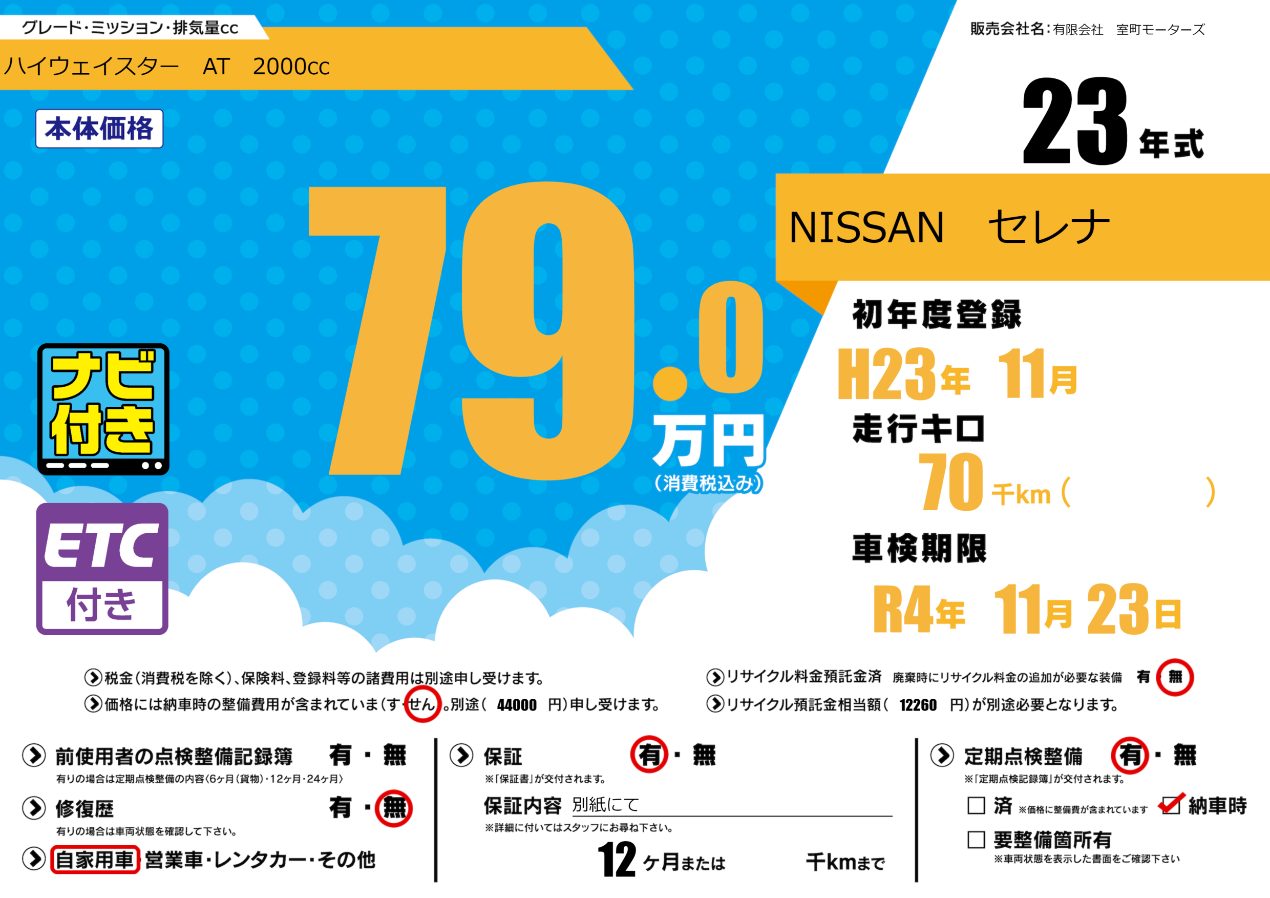 | 車名 | NISSAN セレナ | グレード ミッション 排気量 |