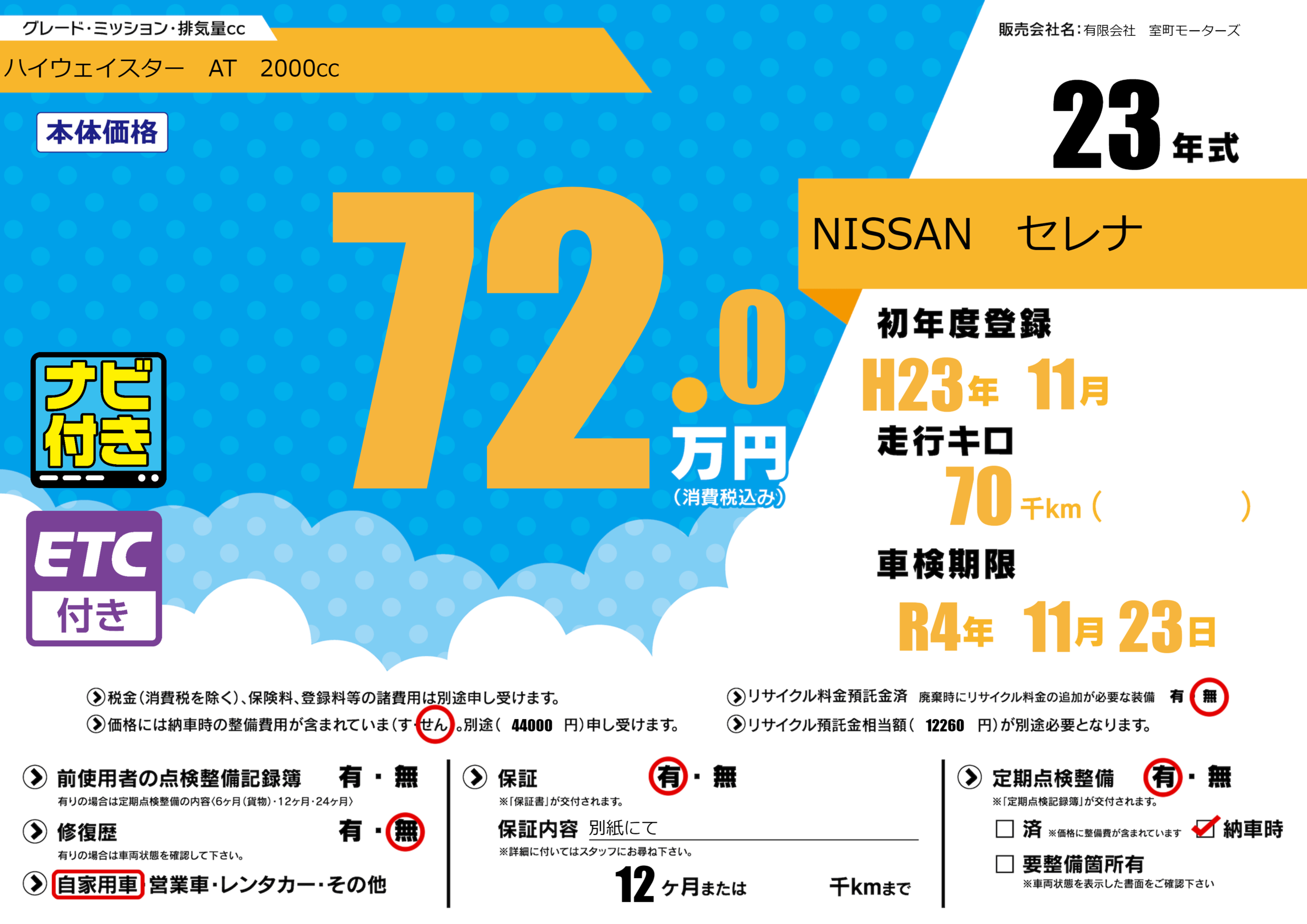 | 車名 | NISSAN セレナ | グレード ミッション 排気量 |