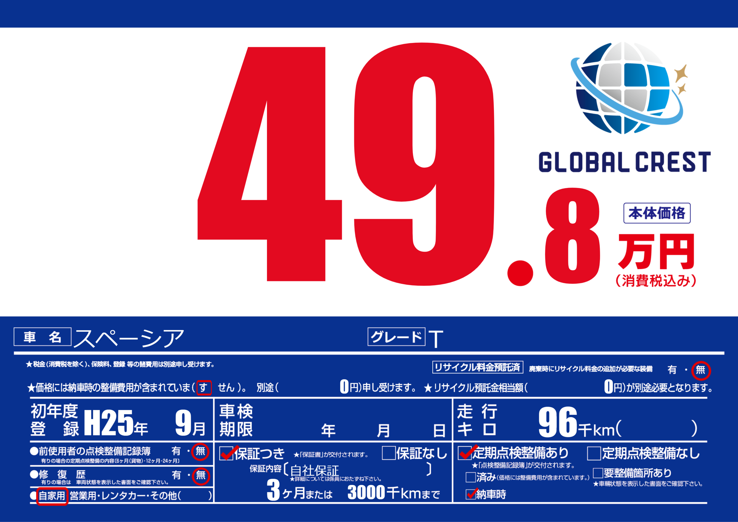 | 車名 | スペーシア | グレード ミッション 排気量 |