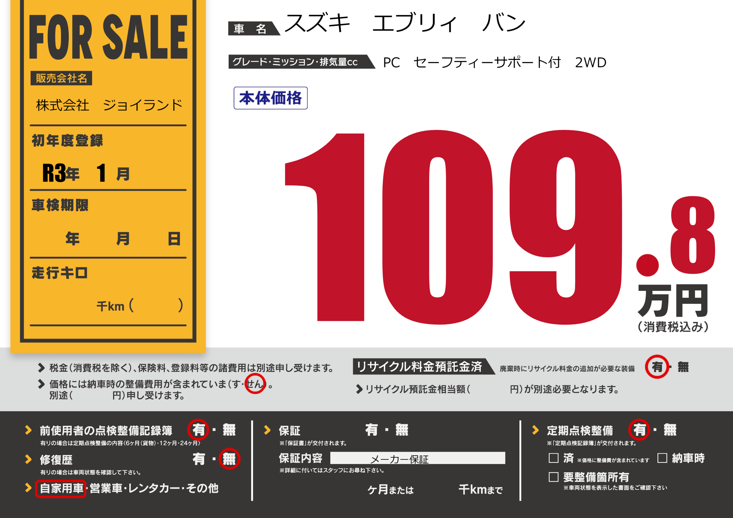 保証なし 保証内容( メーカー保証) ---ヶ月または()千kmまで |