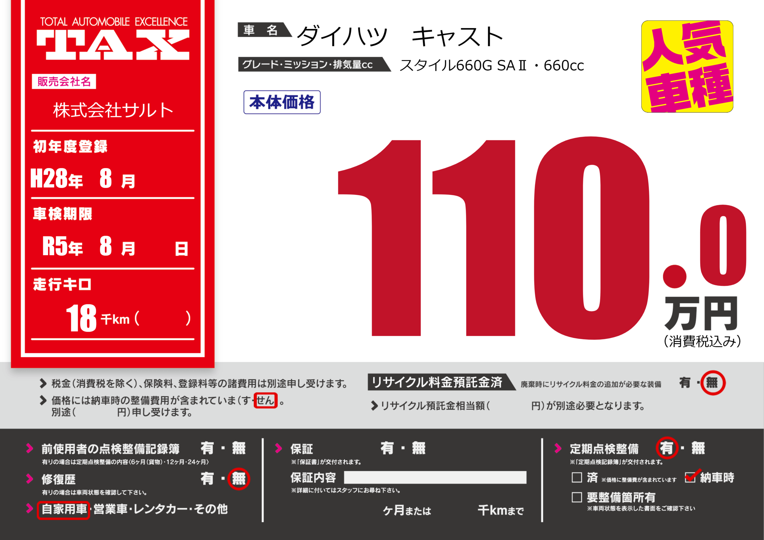 | 車名 | ダイハツ キャスト | グレード ミッション 排気量 |