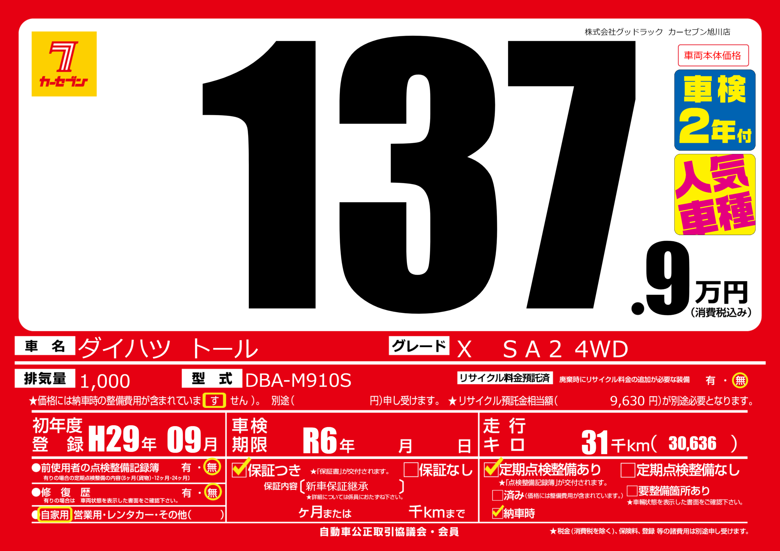 | 走行キロ | 3.1万km | 初年度登録 | H29年09月 |