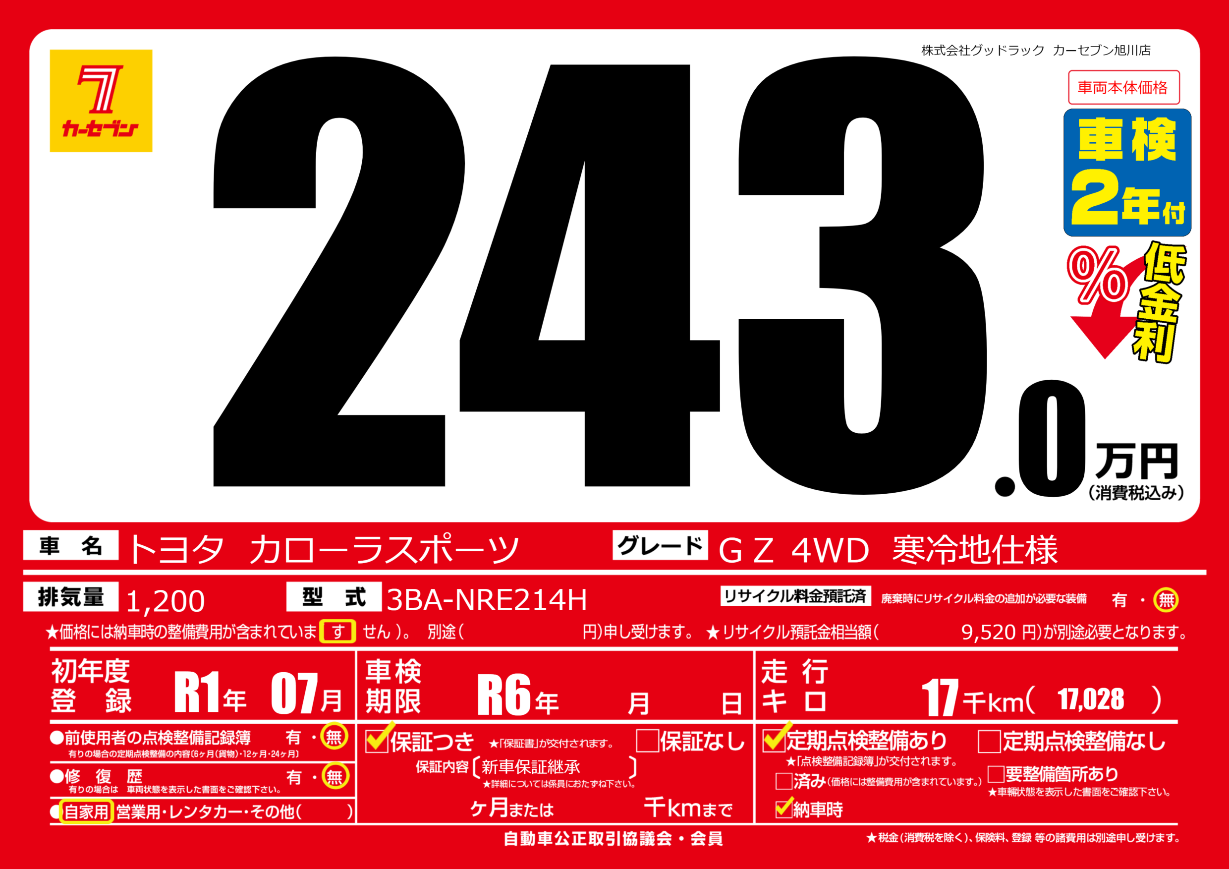 | 車名 | トヨタ カローラスポーツ | グレード ミッション 排気量 |