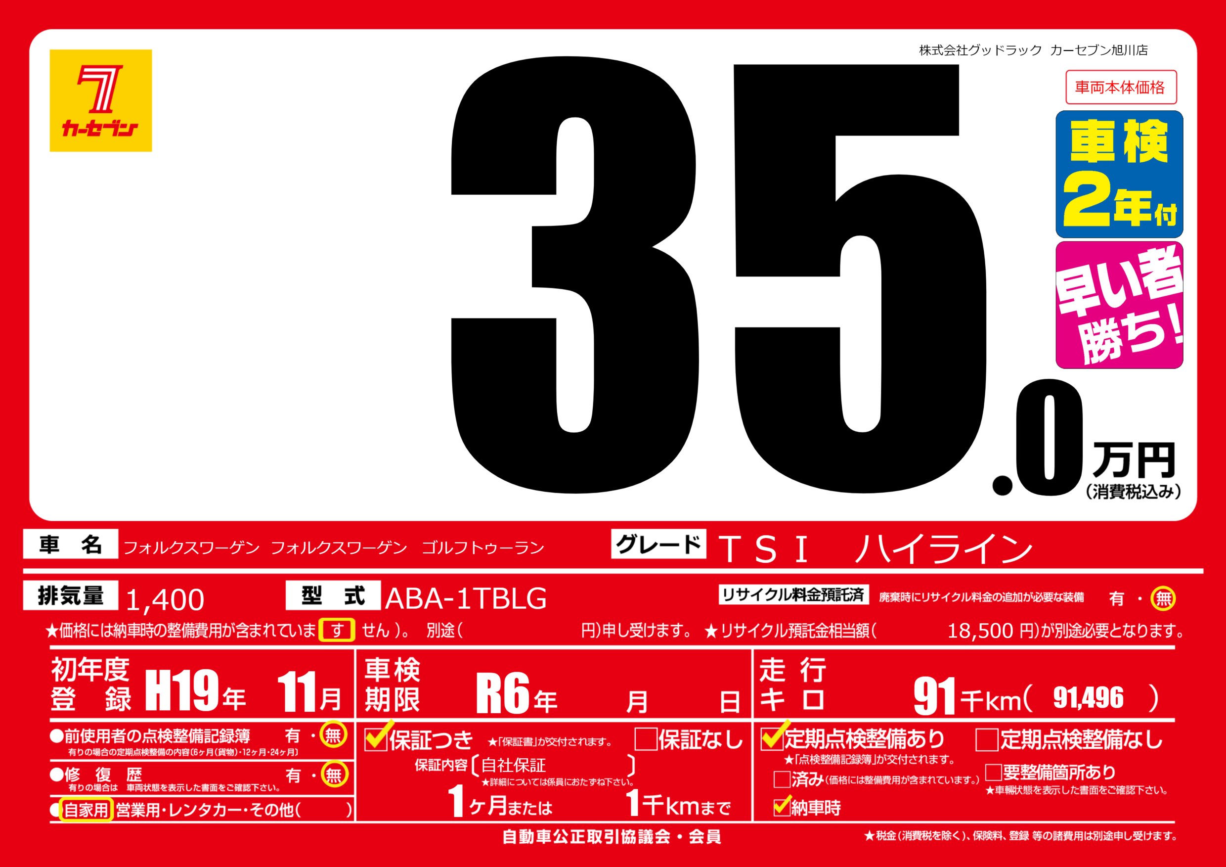 | 車名 | フォルクスワーゲン フォルクスワーゲン ゴルフトゥーラン | グレード ミッション 排気量 |