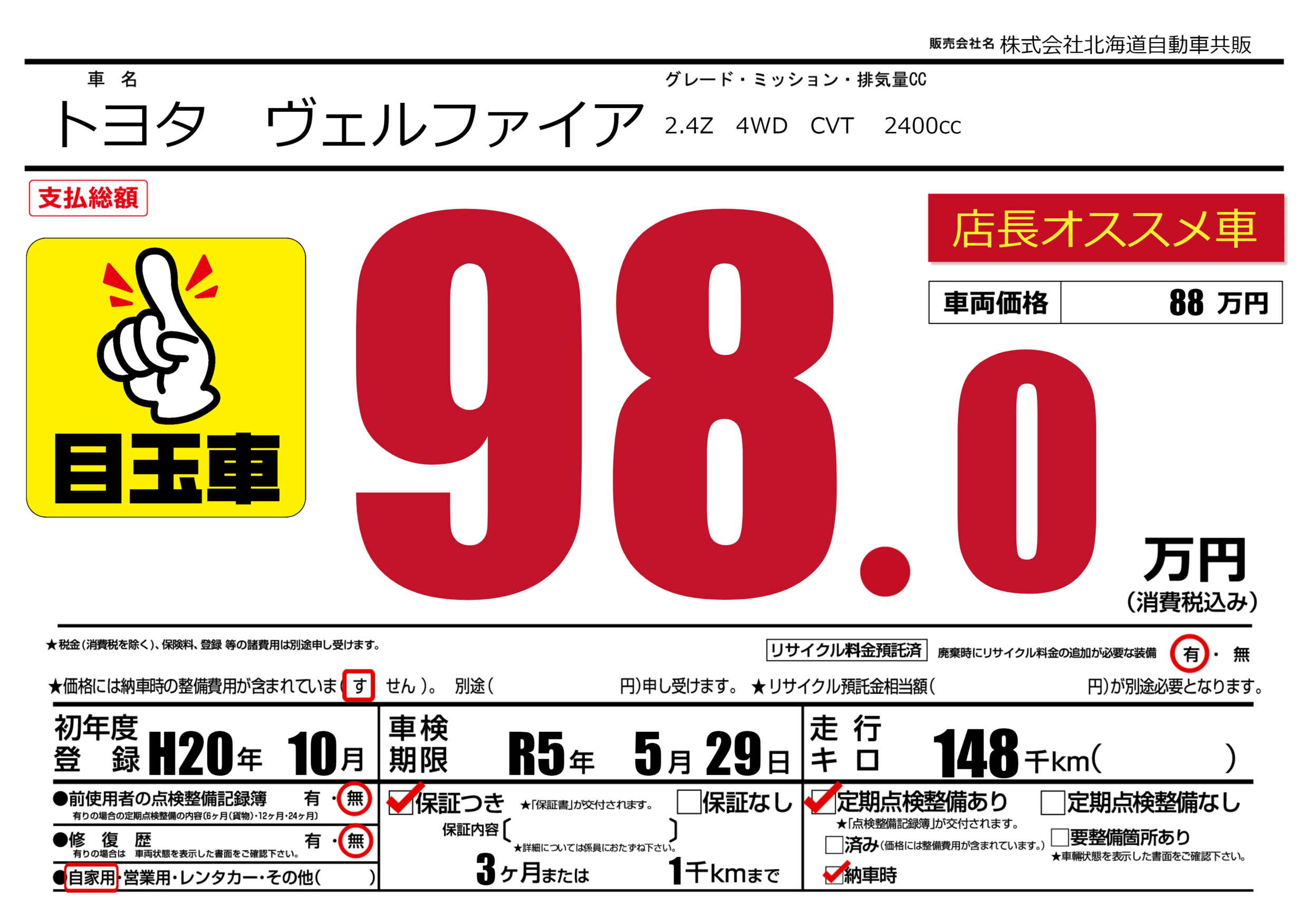 | 車名 | トヨタ ヴェルファイア | グレード ミッション 排気量 |