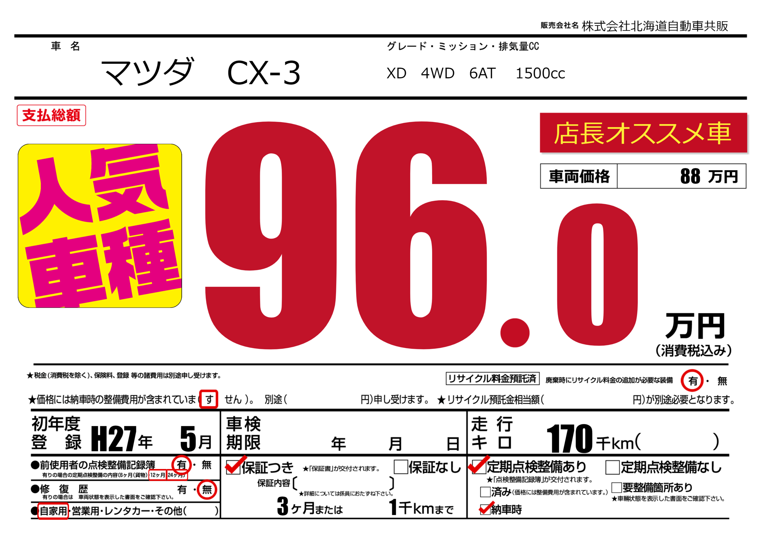 保証付き 保証内容(---) 3ヶ月または(1)千kmまで |