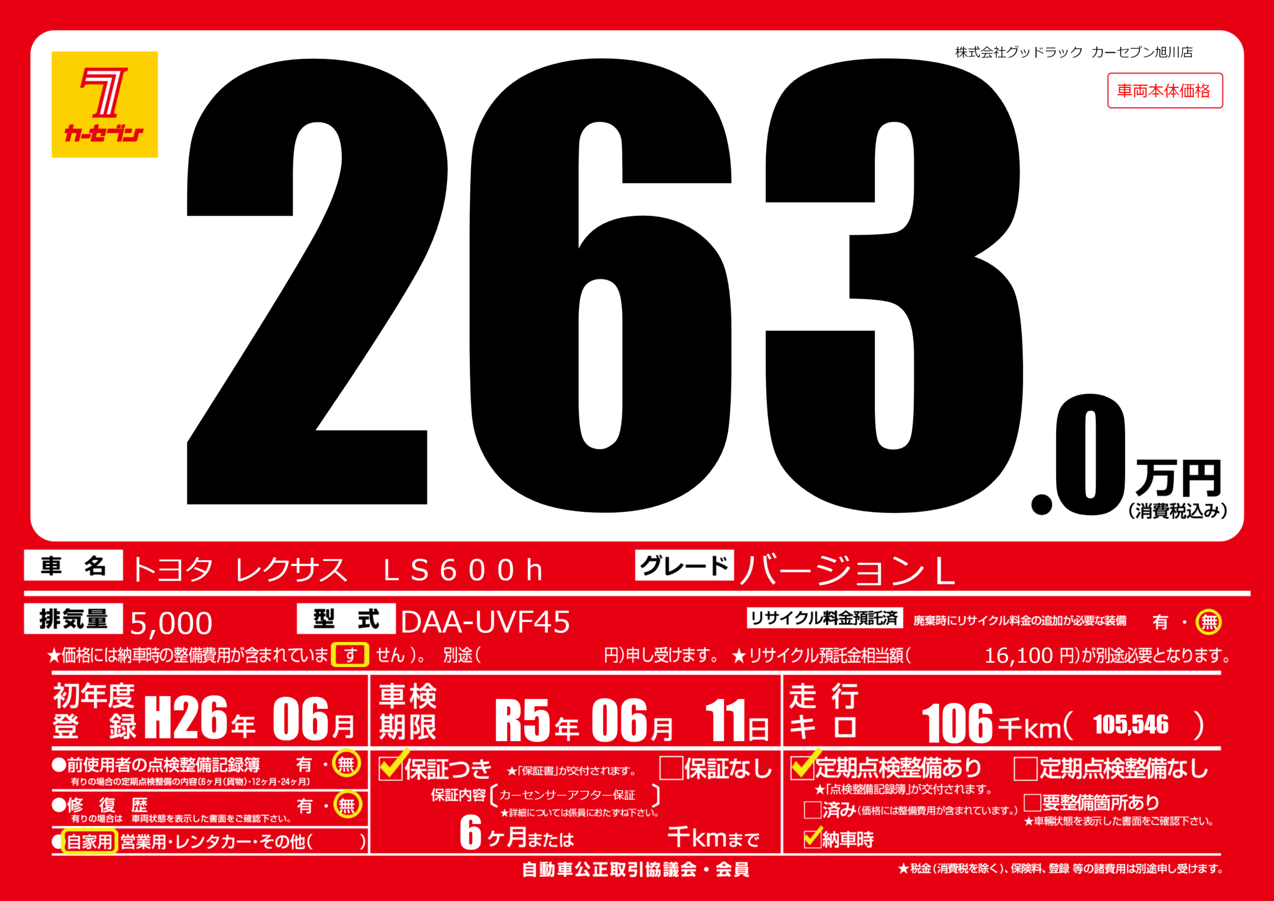 | 車名 | トヨタ レクサス LS600h | グレード ミッション 排気量 |