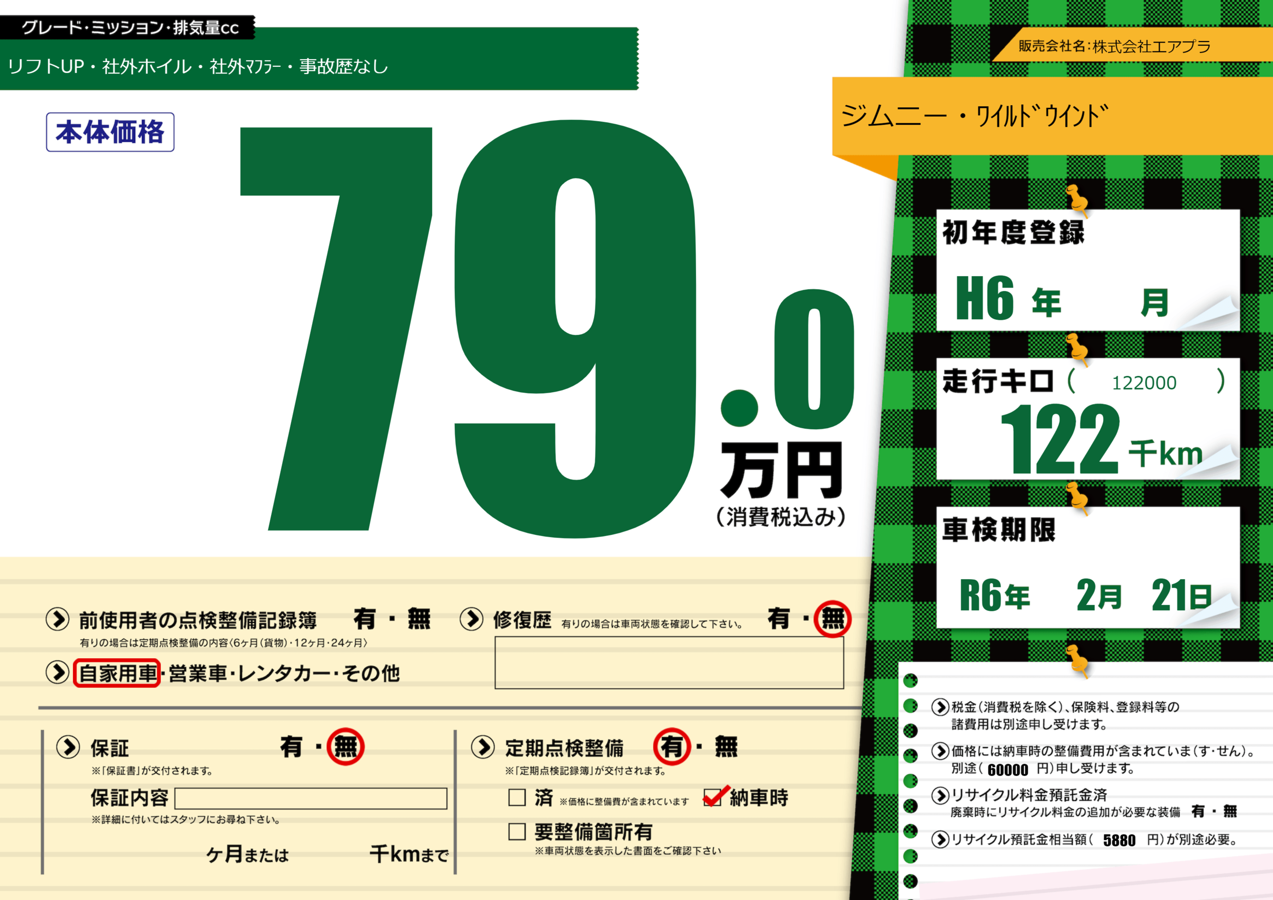 | 車検制限 | R6年 2月 21日 | ||