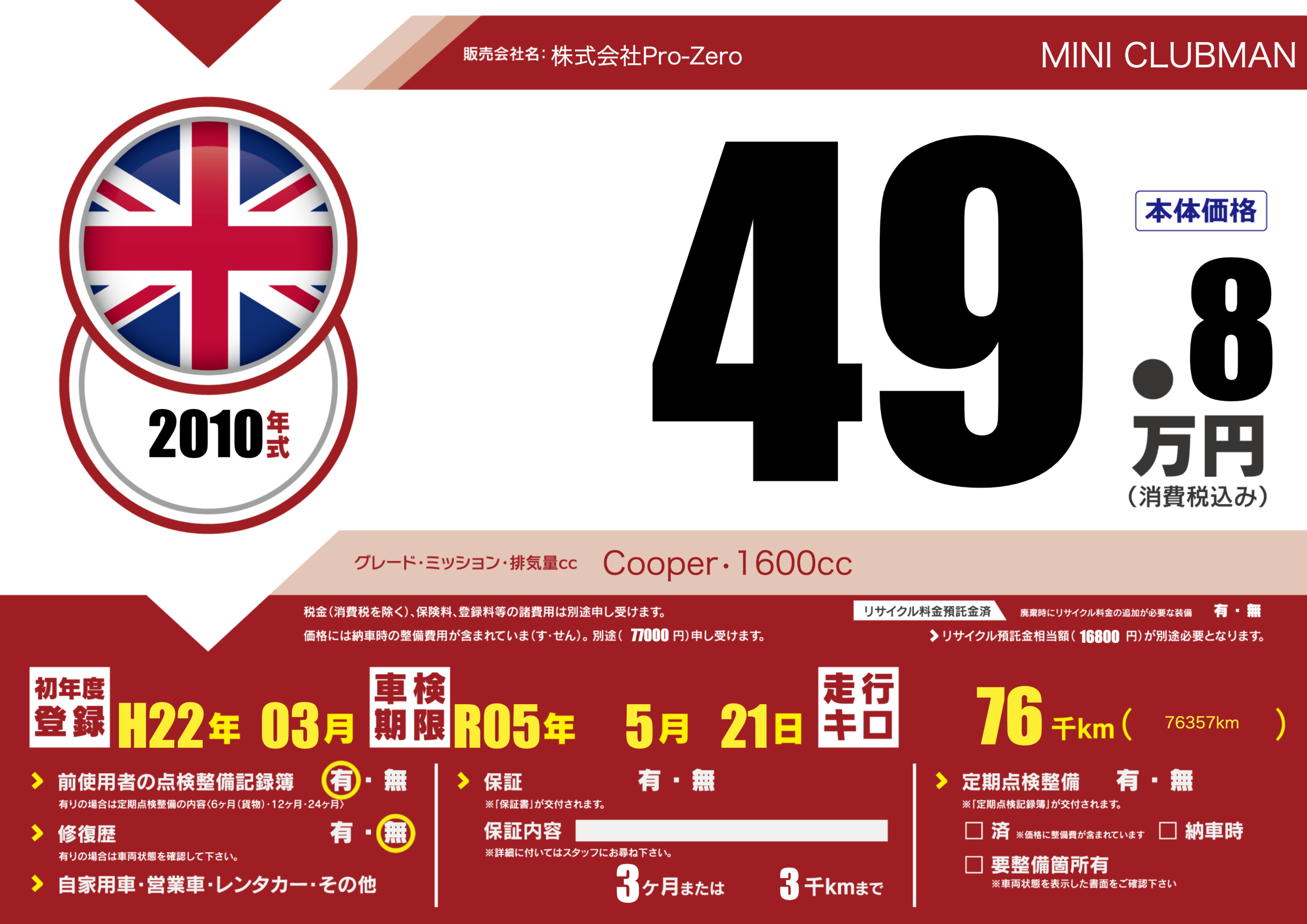 | 車名 | MINI CLUBMAN | グレード ミッション 排気量 |