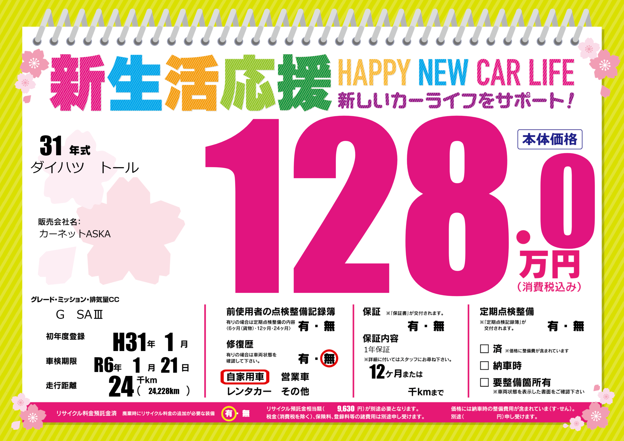 | 車名 | ダイハツ トール | グレード ミッション 排気量 |